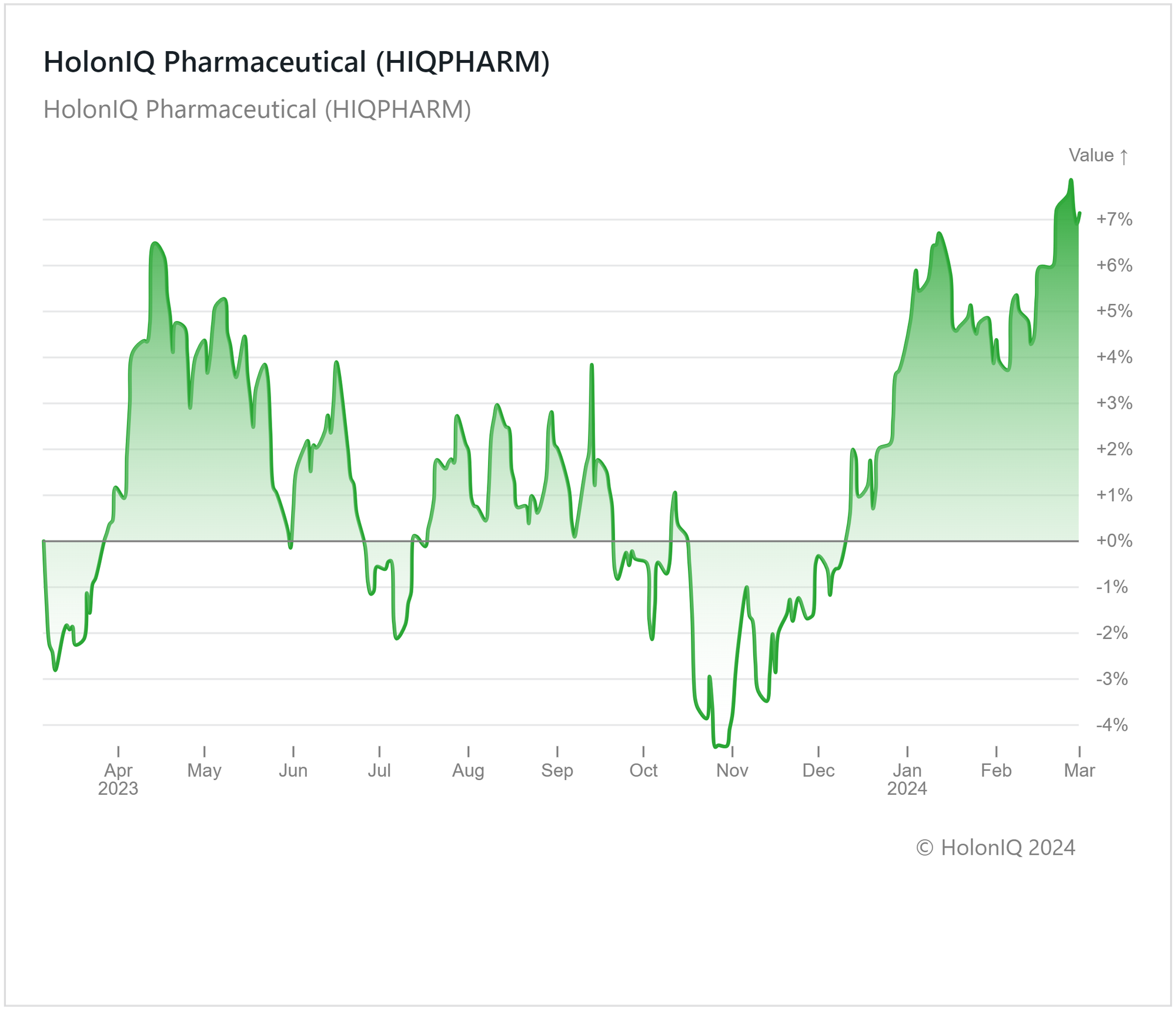 HolonIQβs Pharmaceuticals Index has experienced an 8% increase over the past year. Major stocks in the index have risen, with Eli Lilly & Co. ($743B MCap) increasing 145%, Novo Nordisk ($420B MCap) rising 69% and Merck & Co. ($322B MCap) gaining 14%.