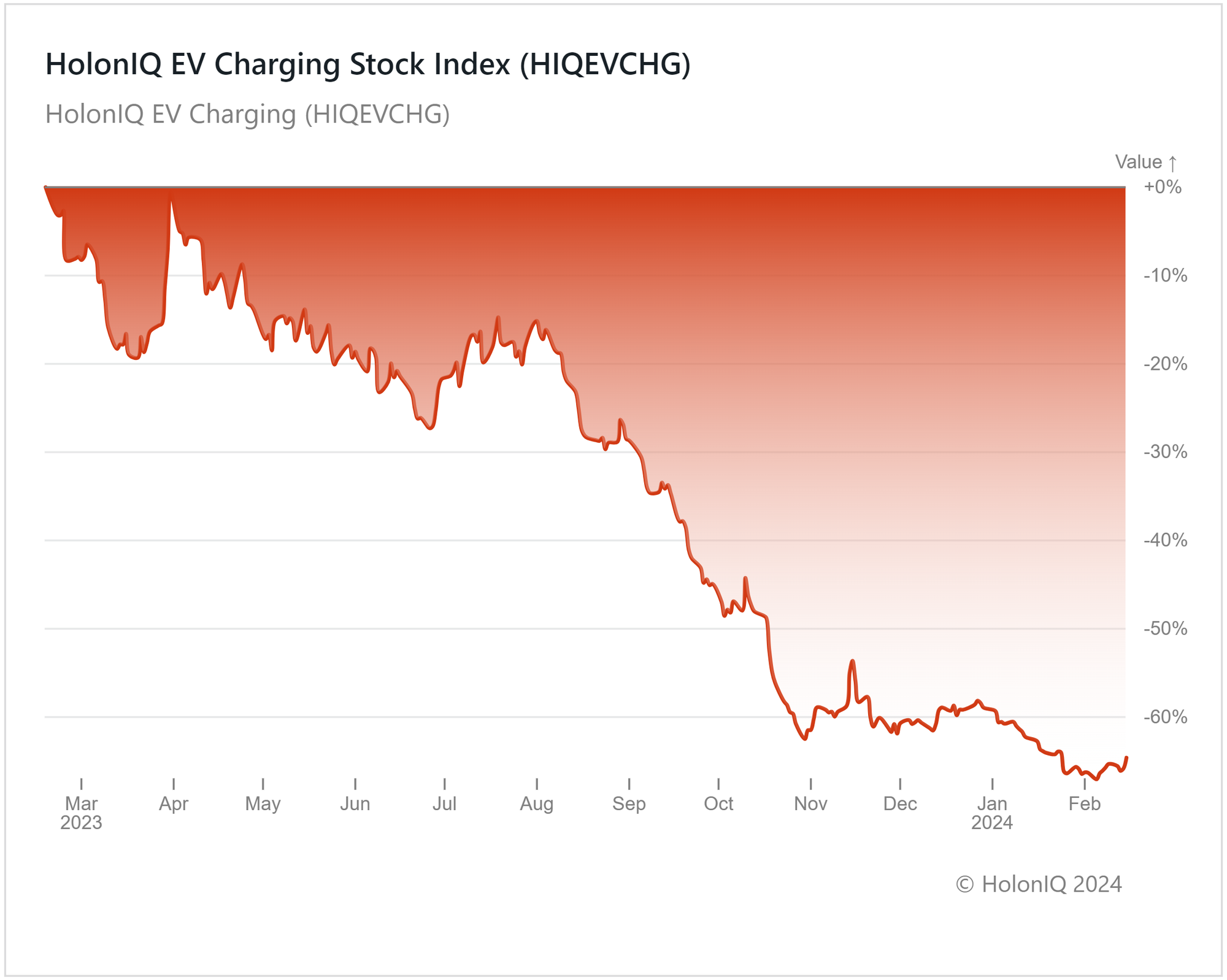 Holon IQβs EV Charging index fell by 65% over the last year as major stocks in the index registered significant declines. ChargePoint Holdings (MCap: $970M) is down 82% YoY, while Tesla (MCap: $628B) and BYD (MCap: $72B) fell 0.8% and 15% respectively, pushing the index down. An exception was ABB Ltd. (MCap: $82B), which rose by 25% in the last year.
