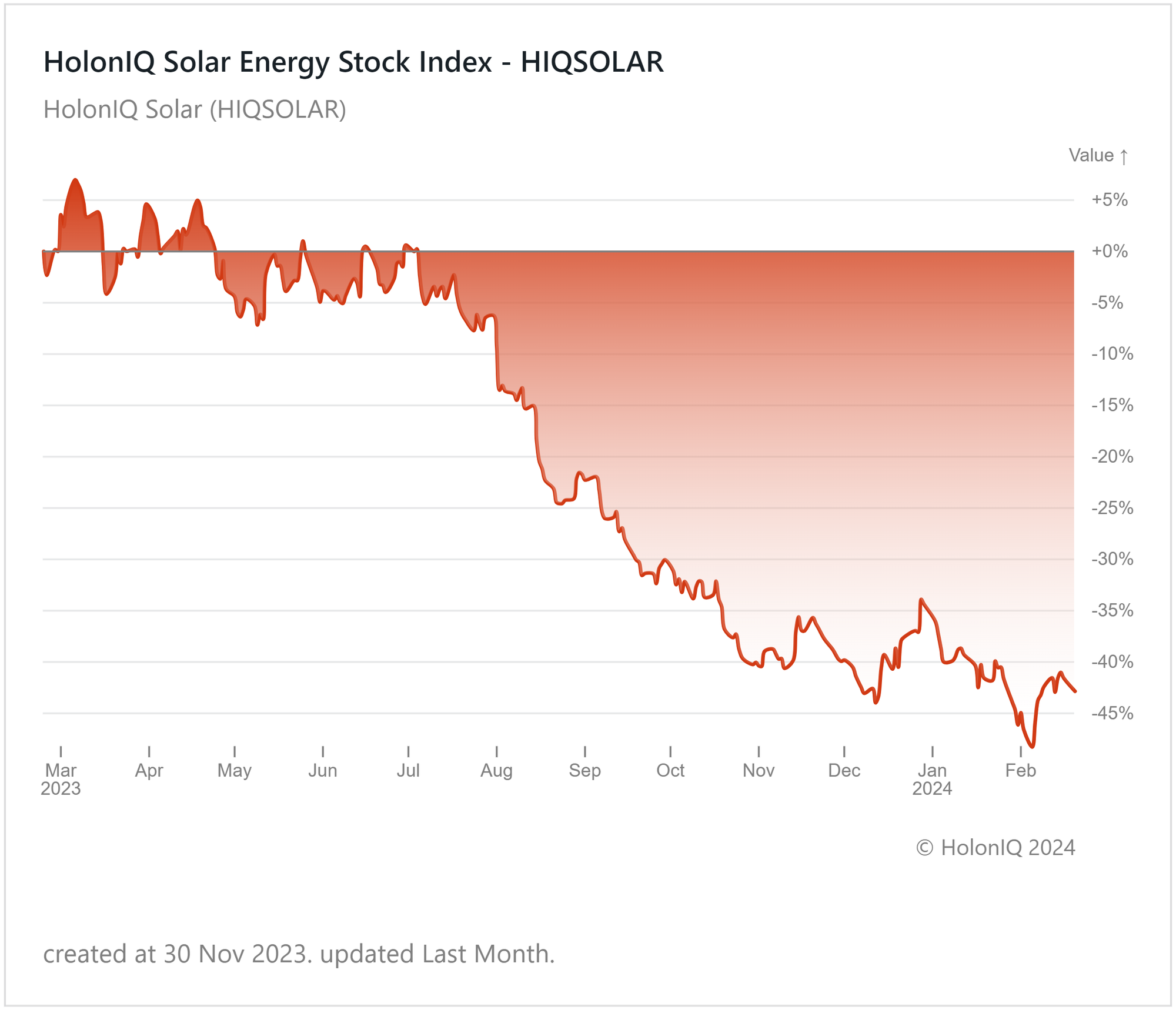 HolonIQโs Solar Index has seen a decline since July 2023, dropping by 42% over the last 12 months. Key stocks in the index have contributed to this downturn, with Enphase Energy (MCap: US$ 17B) falling by 38% YoY and First Solar (MCap: US$ 16B) by 8%. Although the solar industry experienced a notable increase in installations, reaching record levels in 2023, solar stocks have seen consistent declines since 2Q 2023.