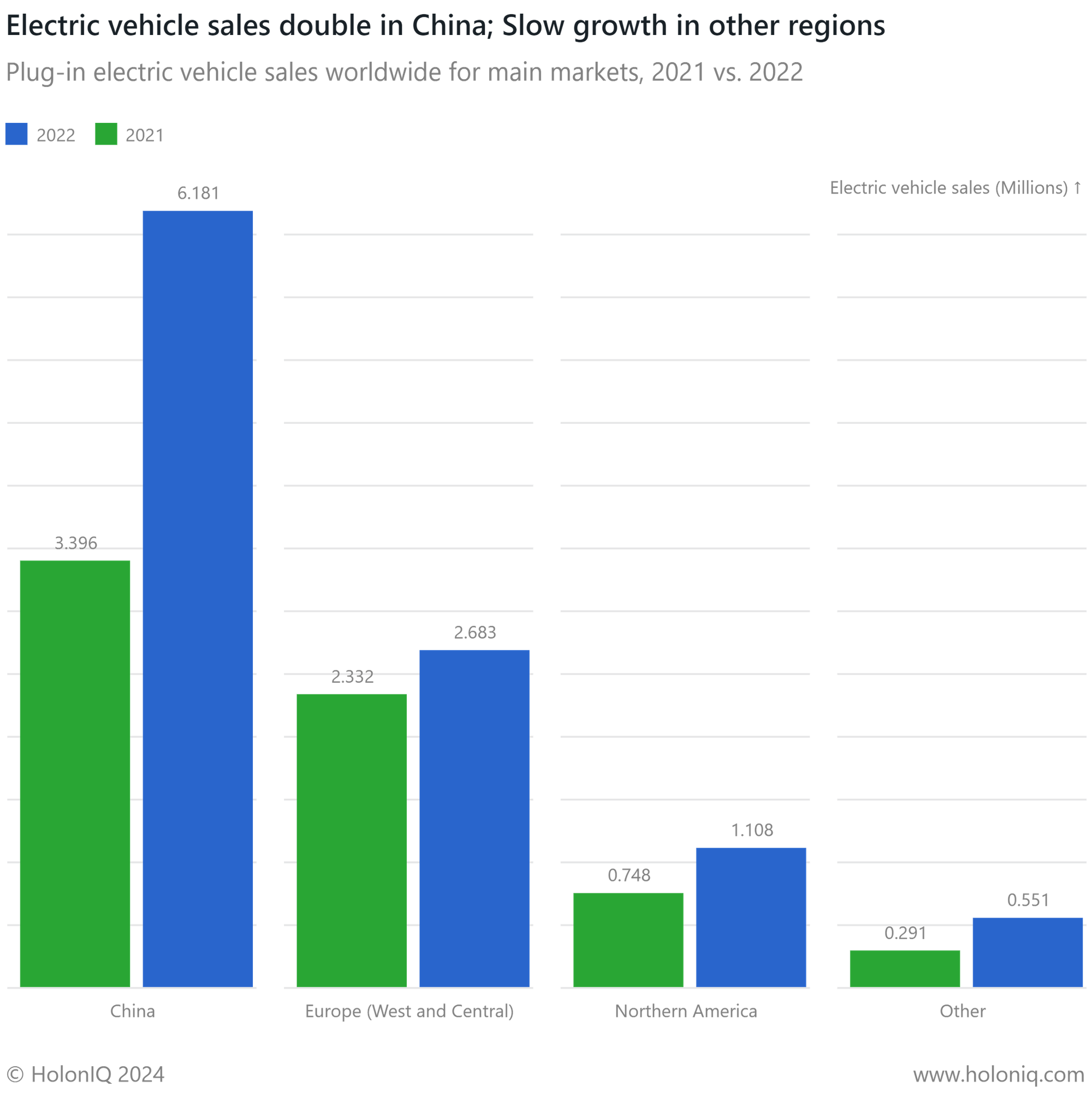 Globally, there has been a remarkable uptick in the sales of plug-in electric vehicles. China led the charge in 2022 by achieving an impressive milestone of 6.2 million electric vehicle sales, marking an 82% YoY increase. However, Europe and North America did not match this pace, showing only 15% and 48% YoY growth, respectively.