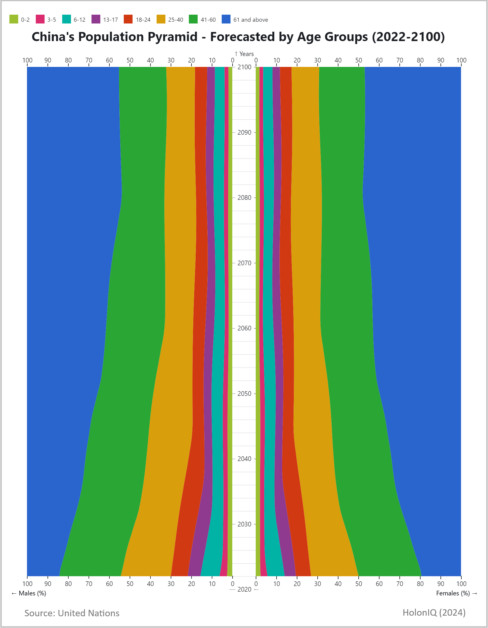 The UN's population forecasts indicate that China is on track to have a predominantly elderly (aged 61 and above) population by 2100. Males aged 61 and above currently account for around 15% of the male population and are projected to rise to nearly 45% by 2100. Women in the same age group are expected to comprise nearly half of the female Chinese population by the end of the century.