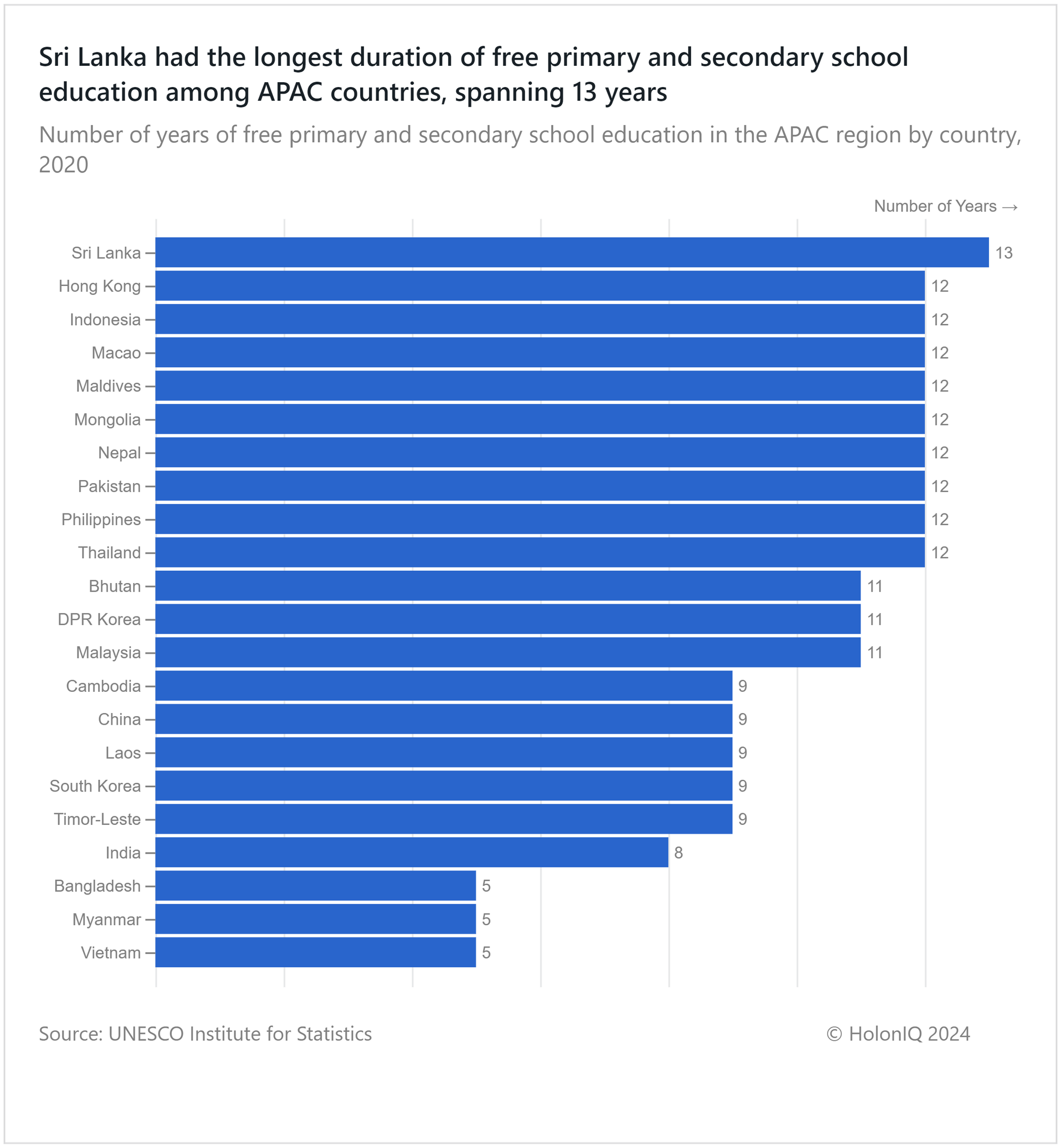 Among Asia-Pacific (APAC) nations, Sri Lanka has the longest duration of free primary and secondary school education, spanning 13 years. China and India offer only 9 and 8 years, respectively. Interestingly, government expenditure on education (as a % of GDP) for Sri Lanka is only 1.2%, while China and India record 3.3% and 4.6% respectively. While Sri Lanka provides a longer duration of free education, the spending is likely insufficient to enhance quality through infrastructure improvements, curriculum updates, and teacher training.