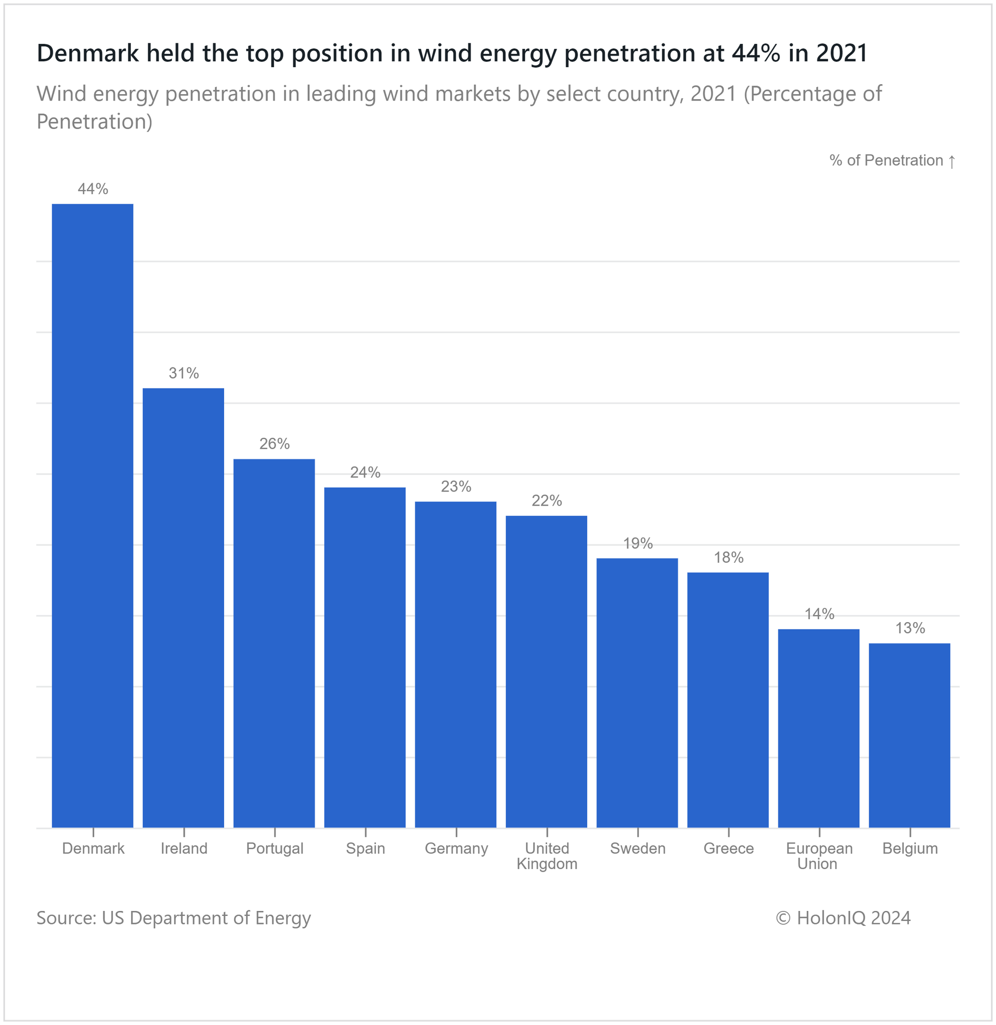 Wind energy penetration is the share of energy supplied to the power grid by wind generation relative to the total energy generated from all sources in the same period. European countries lead in ranking, with Denmark blowing ahead with 44% of wind energy penetration. The United States ranked second in annual wind capacity in 2022 but remained well behind the market leaders in wind energy penetration.