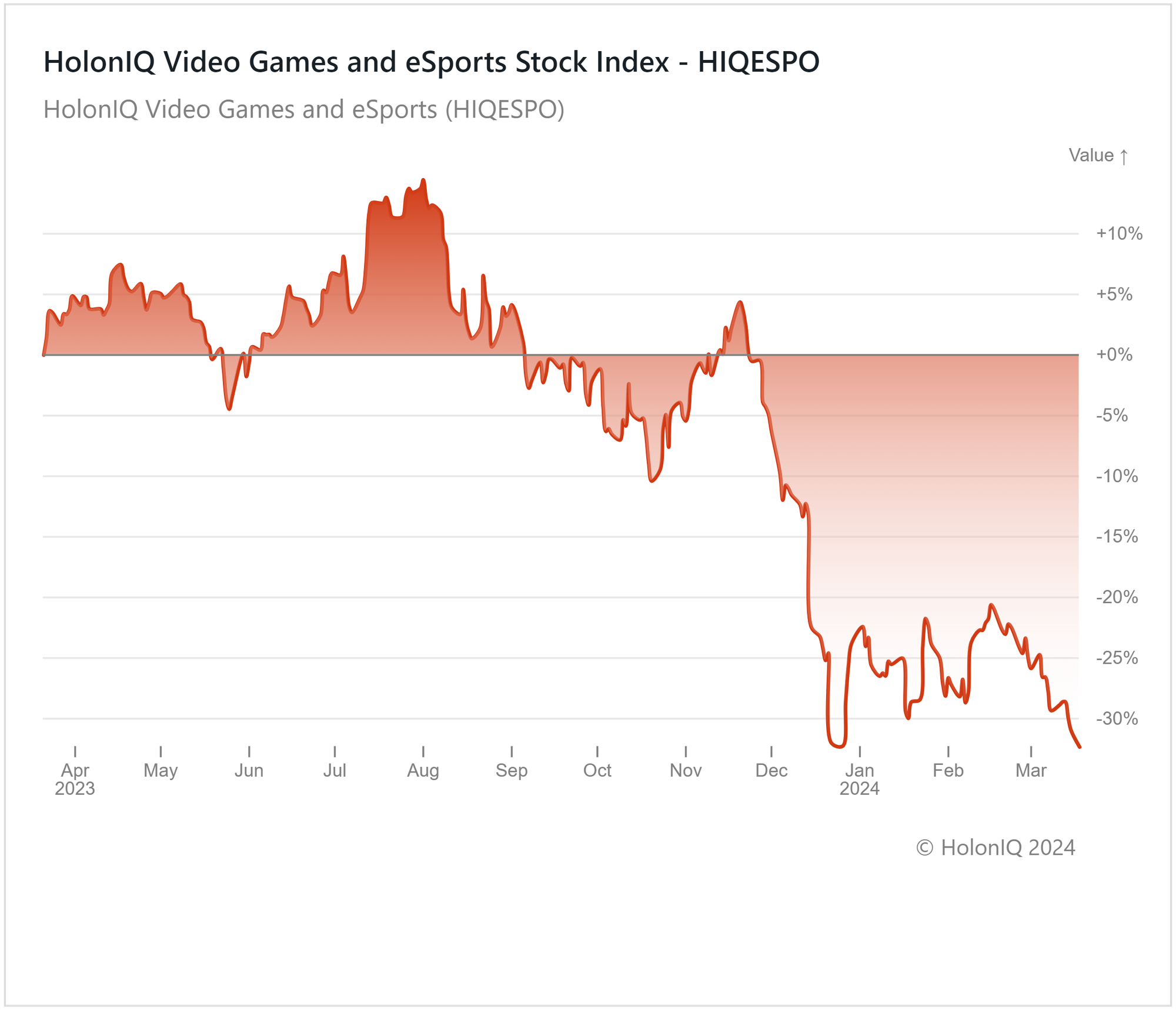 HolonIQ's Video Games & ESports Index has declined by 32% over the past year following a significant downturn in December 2023. The decline in video game and esports stocks over the past year can be attributed to the industry's overexpansion during the pandemic, fueled by heightened demand amid COVID-19 lockdowns. The shifts in consumer preference towards mobile-based games and live-service games have led to a decrease in interest in traditional video games after the pandemic. This has resulted in layoffs across the industry and uncertainty about future growth prospects.