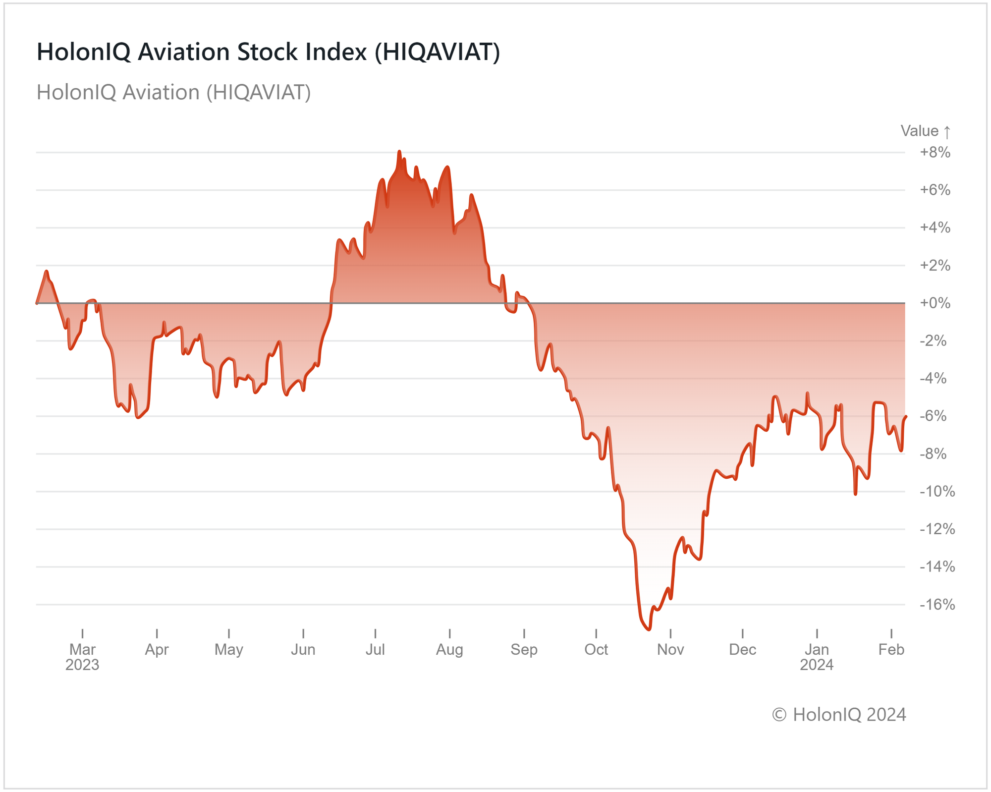 12-month returns for the HolonIQ Aviation Index are down 7%. Major stocks across the board performed differently over the past year. Singapore Airlines and RyanAir returned 15% and 44% respectively; while South West, Air China and United Airlines Holdings saw falls exceeding 10%.