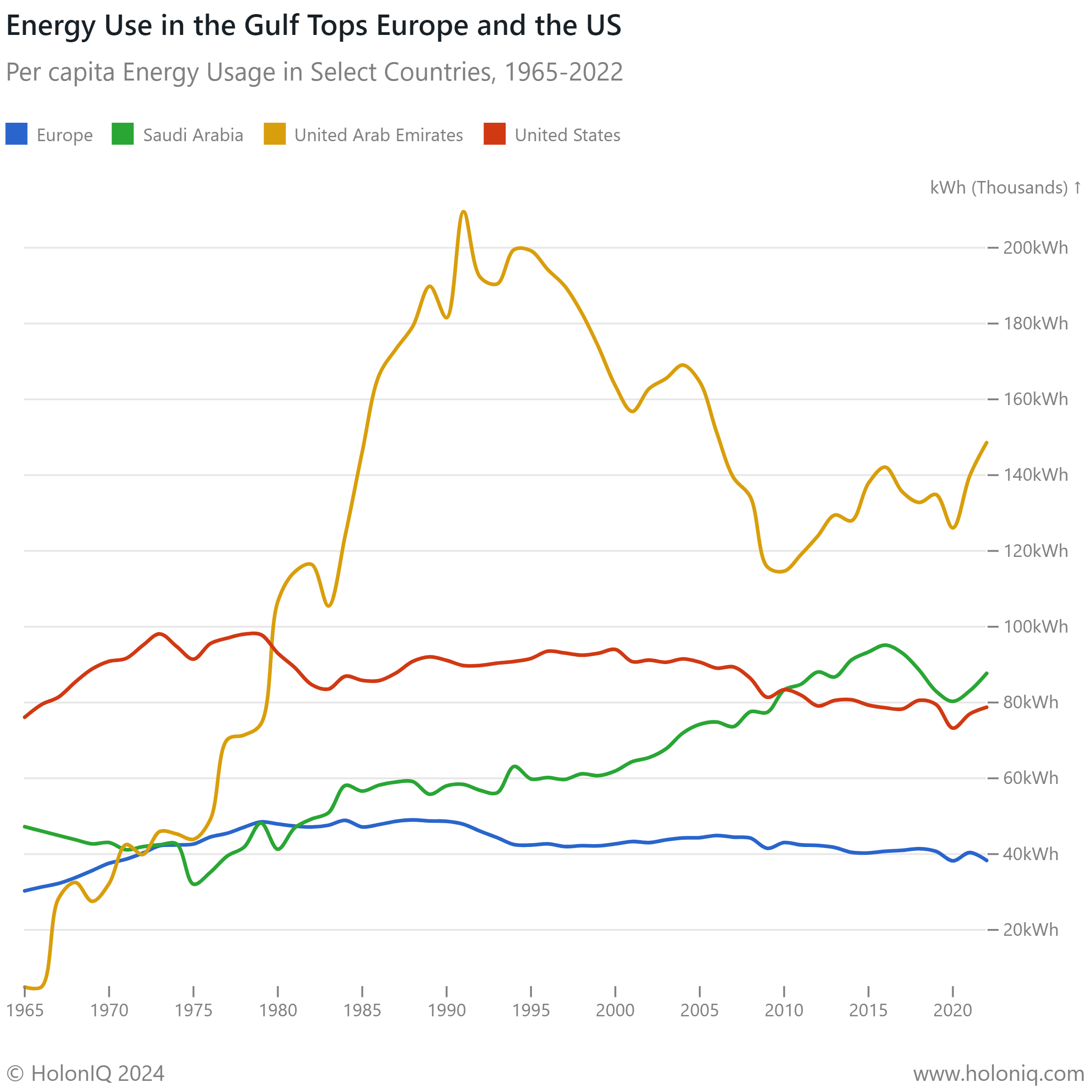 These figures far exceed the per capita energy usage in the United States at 78,000 kWh and Europe at 38,000 kWh, reflecting the Gulf's pivotal role in global energy dynamics. This upward trajectory reflects the growing demand for energy resources in Gulf countries, showcasing economic development, urbanization, and lifestyle changes.