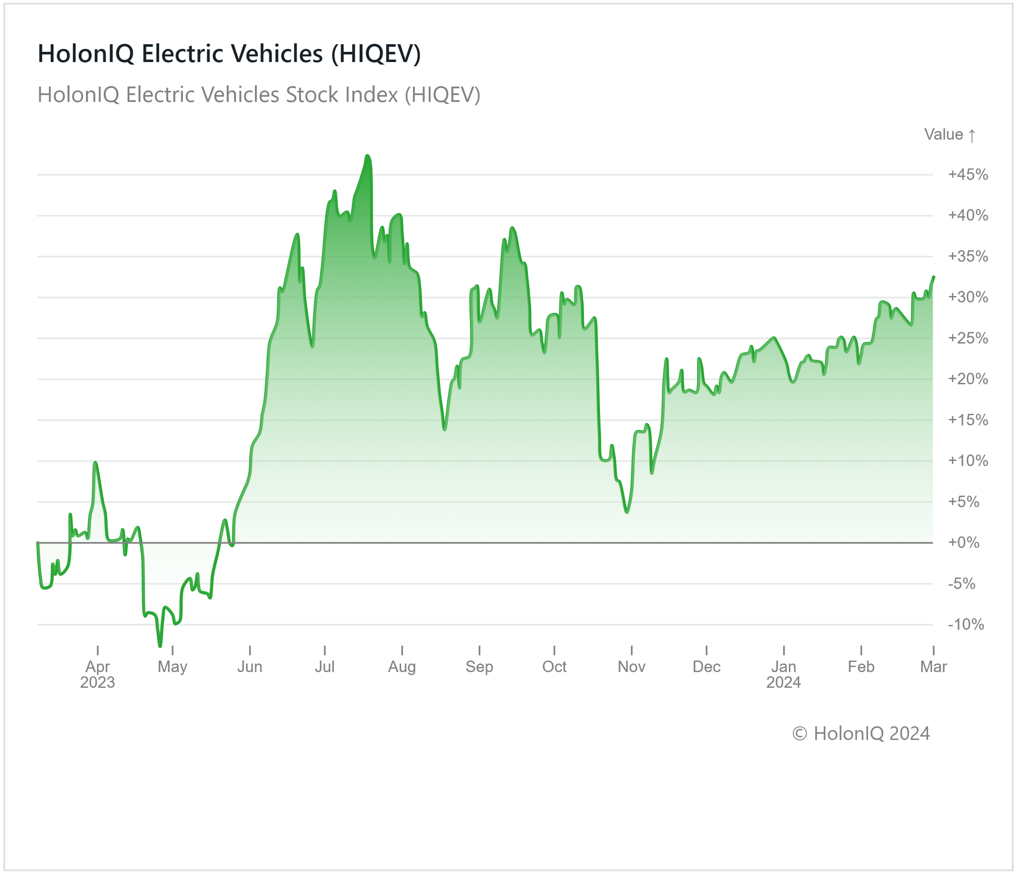 HolonIQ's Electric Vehicles Index bounced back from a dip in May, to increase by about 30% compared to a year ago. Major stocks in the index, such as Toyota Motor Corp ($399B MCap) and Stellantis NV ($87B MCap), have experienced significant growth, with increases of 75% and 49% respectively. However, Tesla ($560B MCap) showed a decline, attributed to shrinking profit margins, increased competition, and uncertainties surrounding pricing and demand in the market. The electric vehicle industry overall has seen slow sales stemming from low demand and an oversupply of inventory in China, the largest EV market in the world.