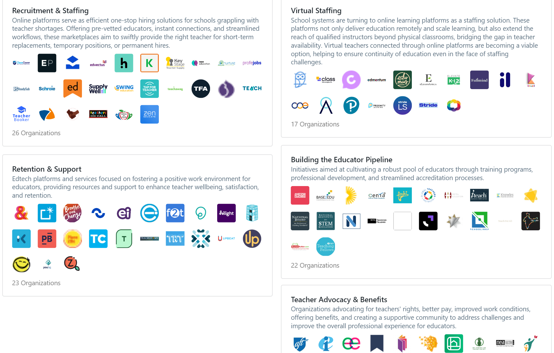 Marketplaces for teacher staffing like ClassCover and recruitment platforms such as TeacherActive and TEACH.org connect teachers and schools, helping them quickly fill vacancies and find substitute teachers. Retention & support platforms like Above & Beyond, Hilight, and Upstrive seek to foster a positive work environment and enhance teacher wellbeing and retention. Virtual teaching platforms like Elevate K-12 and Coursemojo scale learning by expanding the reach of qualified instructors beyond physical boundaries. Advocacy groups and organizations are actively seeking to build the future pipeline of educators and improve conditions for the educator workforce. Expect more school systems to try out novel teaching solutions and more investment into teacher preparation programs across the globe.