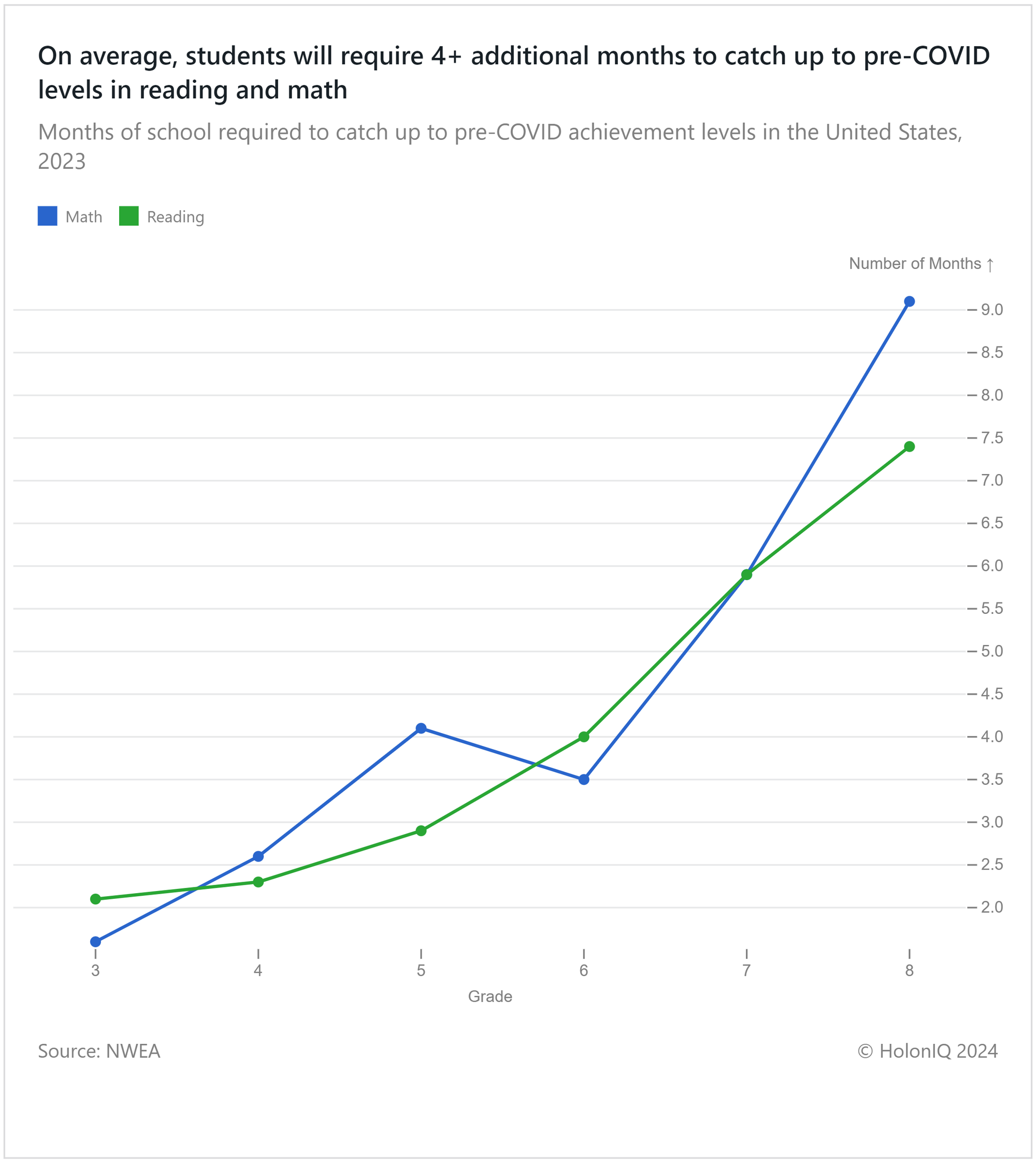 During the COVID-19 pandemic, school closures caused significant learning disruptions, prompting the need for additional schooling for students to reach pre-COVID levels. US students require an additional 4.1 months in reading and 4.5 months in math to catch up, with the most notable impact observed in middle school, where 8th graders need an extra 9.1 months in math. Marginalized students face wider learning gaps, with Black and Hispanic students needing 6.2 and 6.4 extra months respectively, compared to 4.3 and 5.3 months for Asian and White peers. Ineffective infrastructure and planning for online learning environments, coupled with limited professional development on integrating technology into teaching, resulted in suboptimal learning experiences for many students.