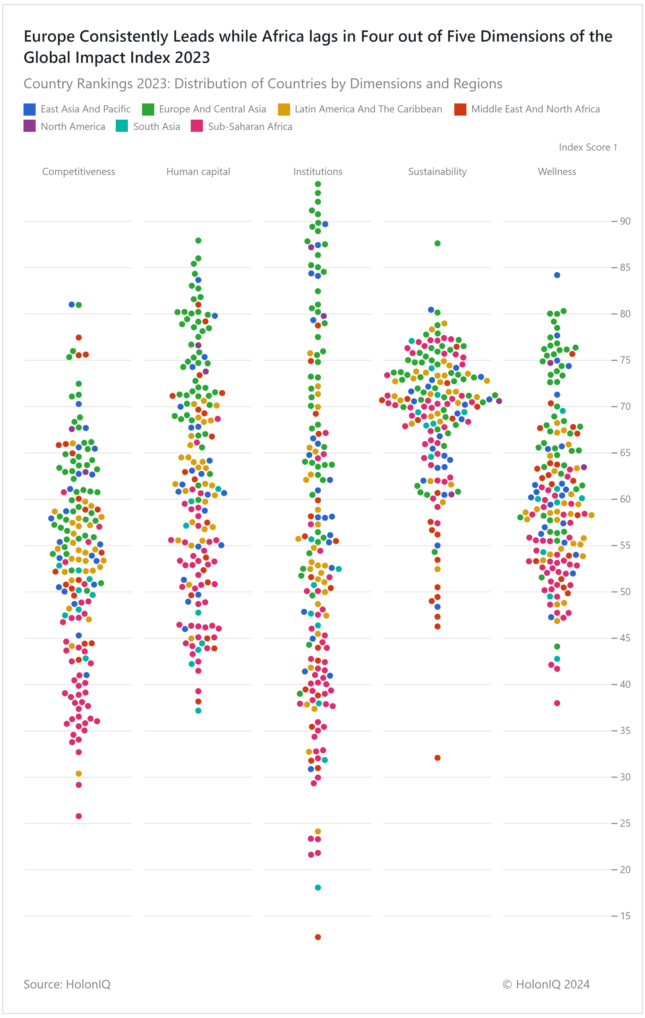 The 2023 HolonIQ Country Rankings reveal the intricacies of how countries perform relative to each other along 5 dimensions and 10 pillars. While Europe and Central Asia dominate in Human Capital, Wellness, Institutions, and Competitiveness, sub-Saharan Africa only stands out in Sustainability. This highlights the complex relationship between economic development and sustainability where low-income nations are also likely to have lower per capita carbon emissions. Although Denmark, Iceland, Switzerland, Sweden, and Norway lead the overall rankings, resource-scarce nations like Yemen, Sudan, and Central African Republic face broader challenges in most dimensions. However, the Central African Republic's remarkable 13th place (out of 168 countries) in sustainability demonstrates the inherent trade-offs and potential strengths within diverse national contexts.