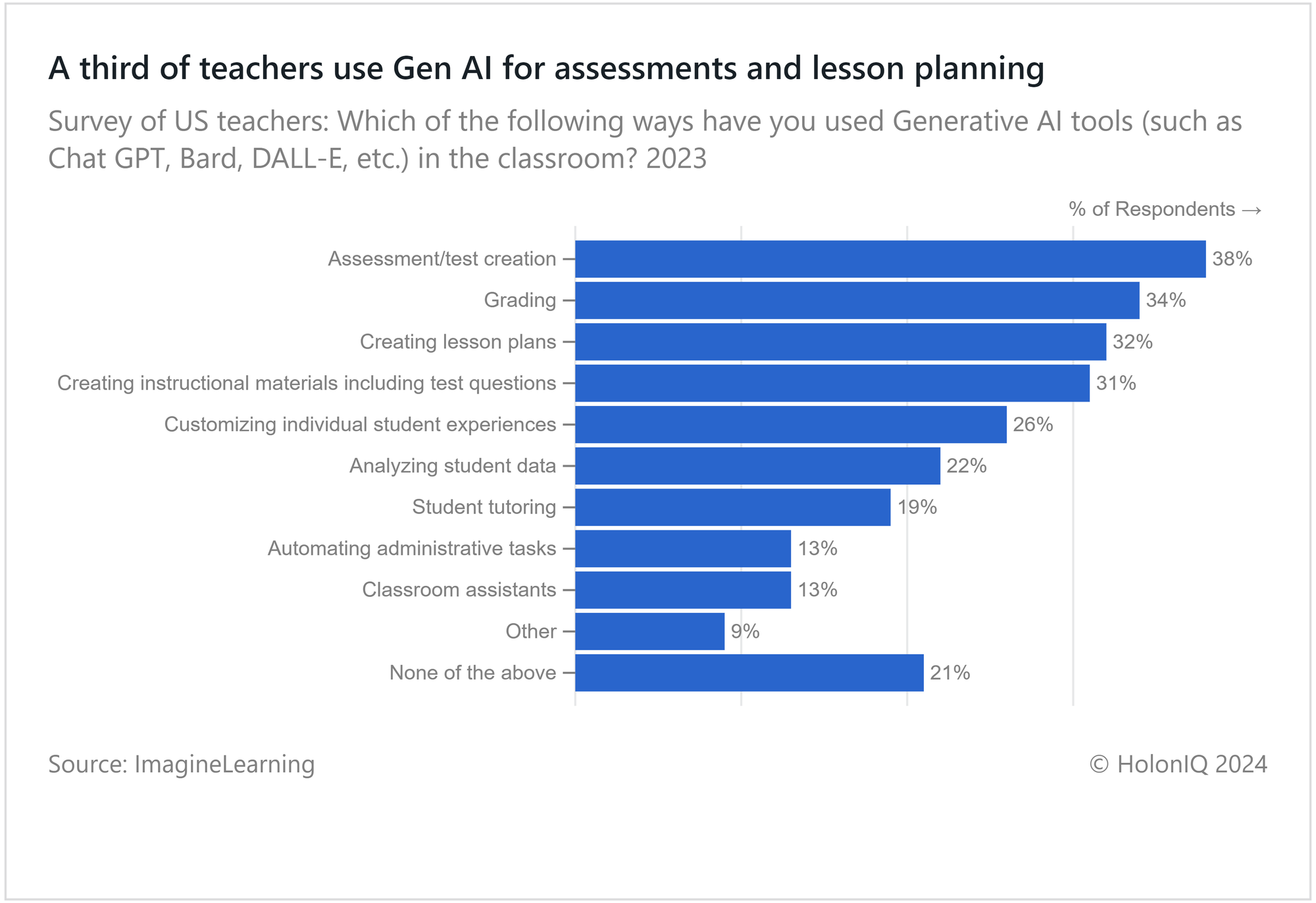The insights from a 2023 survey of US teachers reveal that one-third have embraced Generative AI to streamline their workflow by creating lesson plans, managing administrative duties, and automating grading processes, thus freeing up valuable time. Generative AI has the potential to enhance the teaching landscape and enrich student learning by improving educational quality and efficiency. Additionally, by providing swift and detailed feedback on student work and helping to improve the quality of assessments, this technology can cultivate a more satisfying teaching and learning experience, consequently increasing teacher retention rates.
