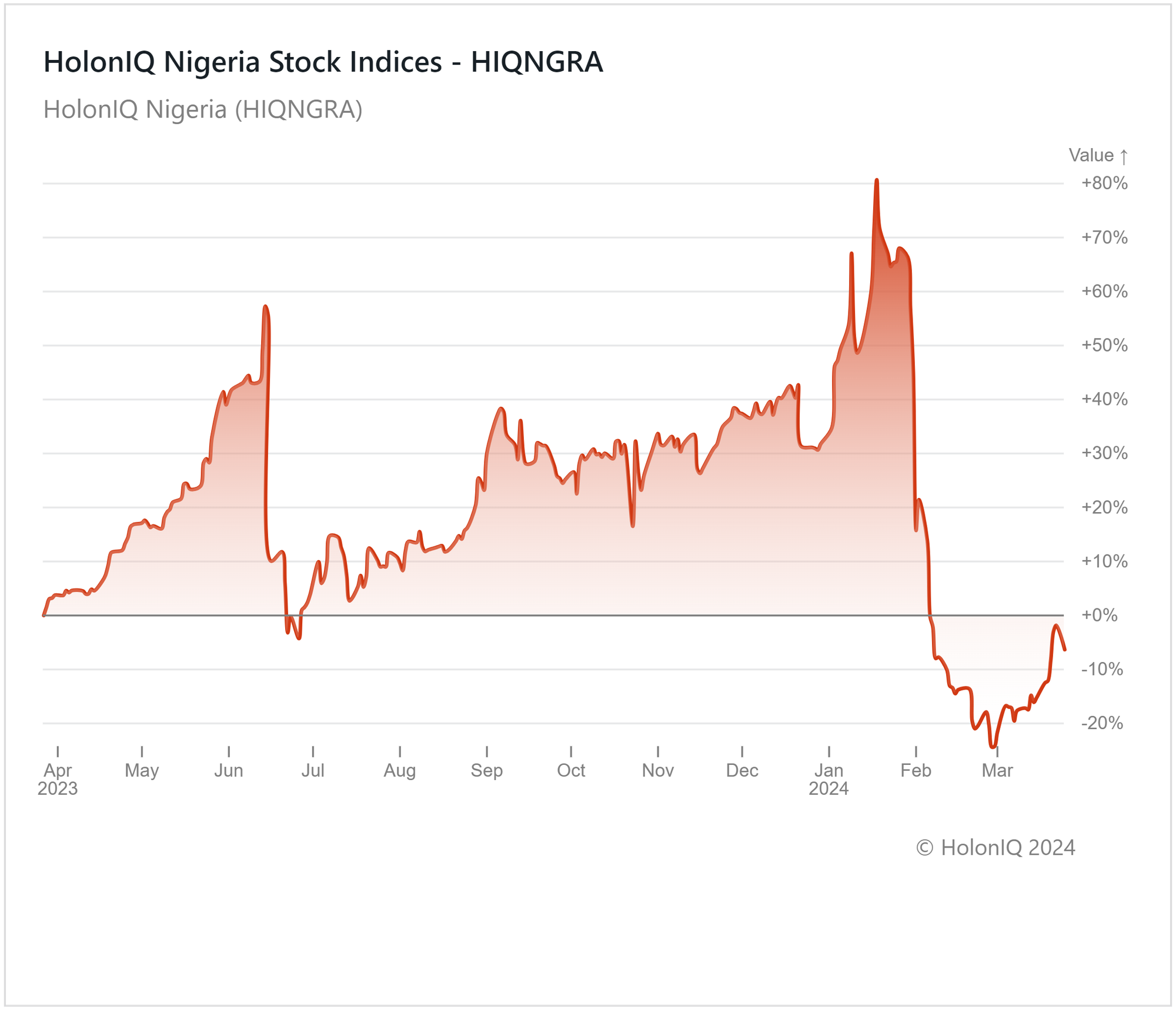 HolonIQโs Nigeria stock index declined by 3% over the past year, reflecting a correction following economic reforms in the country. President Bola Tinubuโs policy decision to withdraw fuel subsidies had a chain reaction that led to 31.7% inflation levels in February 2024. The peg on Nigeriaโs currency was also removed in 2023. Since then, it has observed declines of more than 200%, leading to higher import costs for businesses. This was compounded further by price increases as a result of inflationary effects globally. As firms grapple with this uncertainty, stocks in the index, including Guaranty Trust Holding Co. ($990M MCap) and Zenith Bank ($865M MCap), have observed declines.