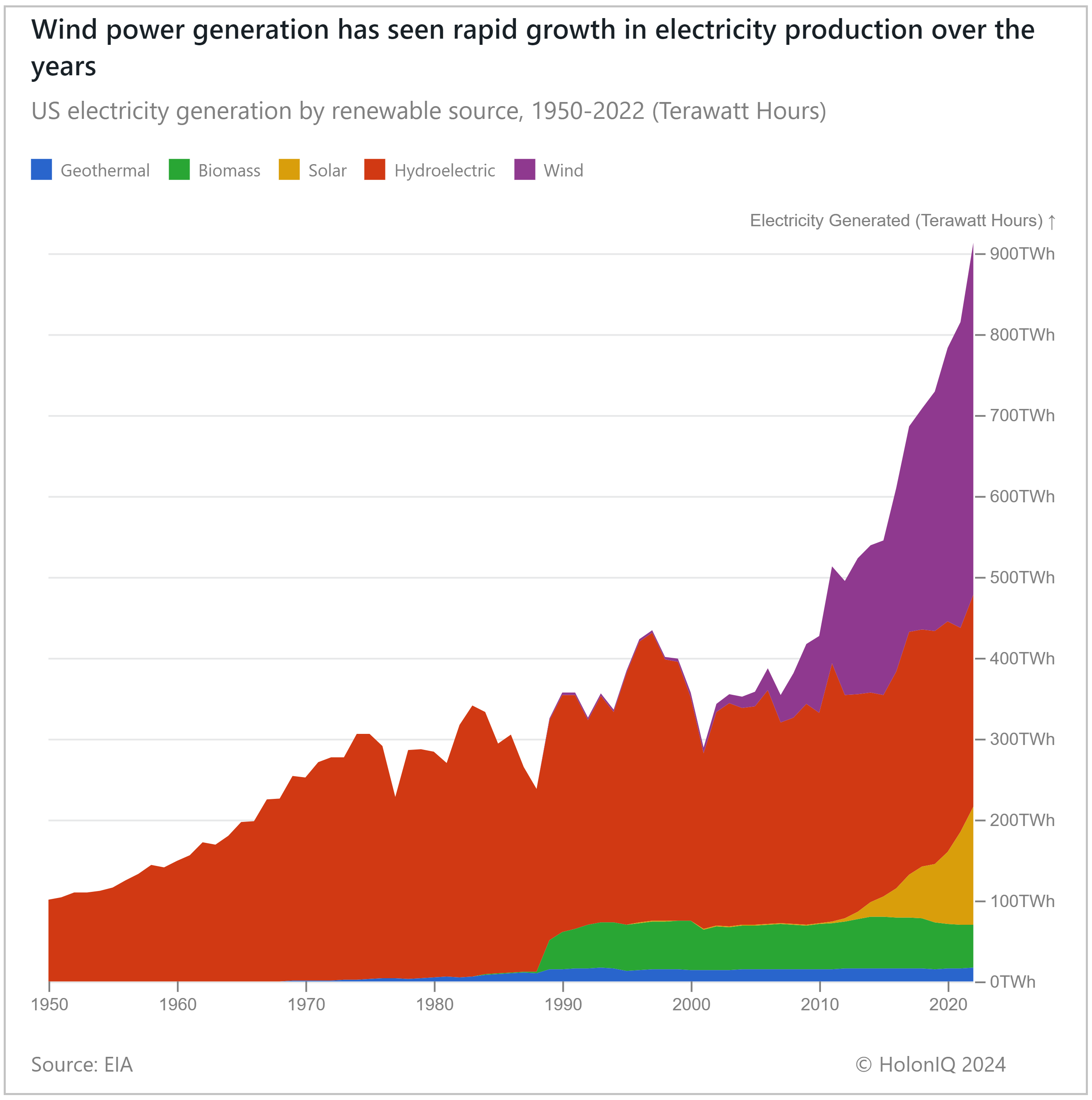 Globally, solar is the leading renewable source of energy, with 1 terawatt of solar capacity installed by 2022. However, the US has deviated from this trend, with wind energy taking the lead in renewable electricity generation, growing rapidly to reach 435 terawatt-hours by 2022, which is 6x that of 2015. The US also exhibits a significant reliance on hydroelectric power, which constitutes 28.7% of its total renewable electricity generation and is the US's second largest renewable energy source. Geothermal and biomass in the US have experienced stagnant growth since their introduction, exhibiting low growth rates in electricity generation over the years.