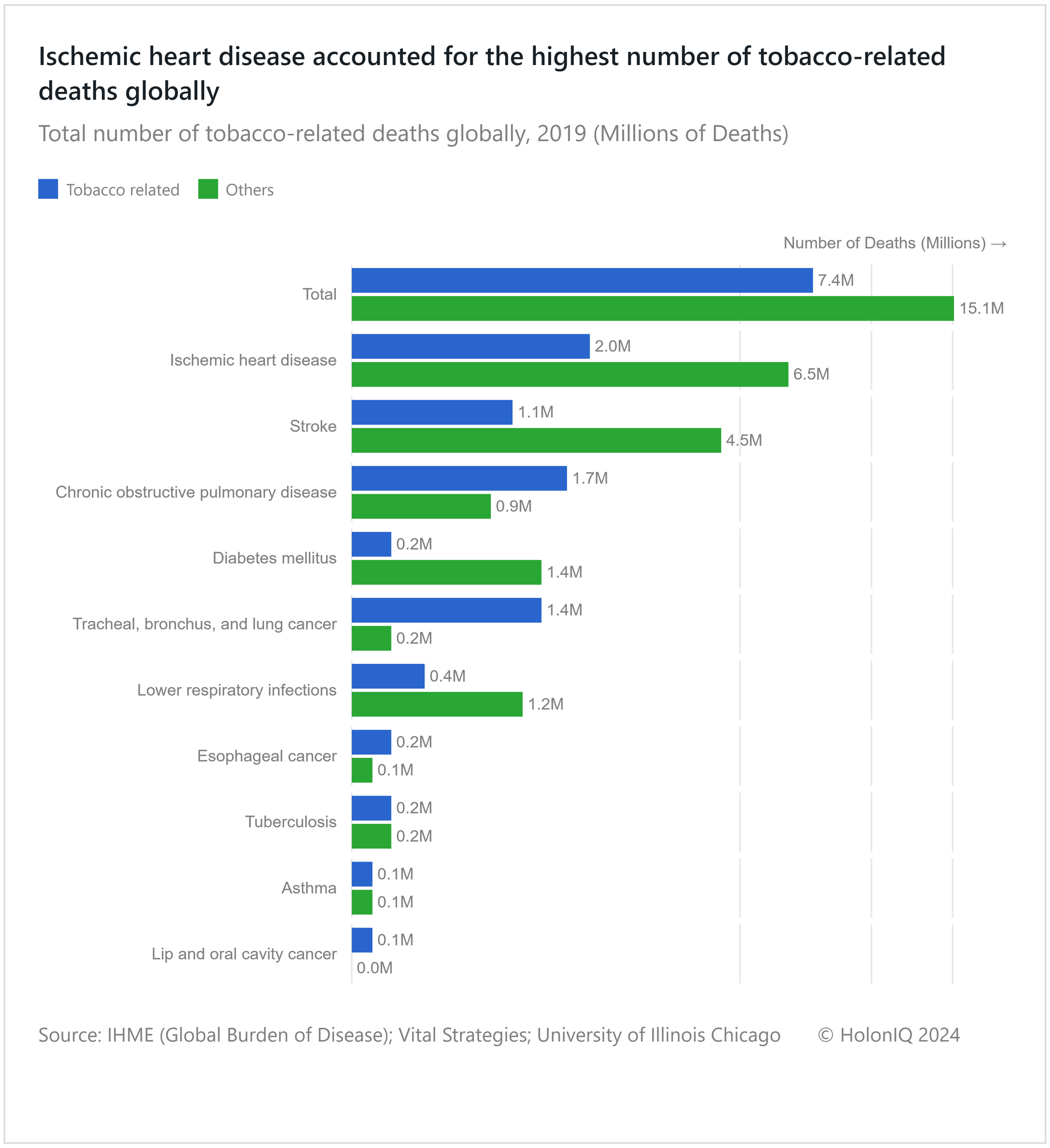 Smoking is a significant global health issue, resulting in 7.4 million deaths annually. Ischemic heart disease ranks as the primary cause of smoking-related fatalities, with nearly a quarter of all ischemic heart disease deaths (2 million) attributed to smoking. In comparison, asthma and lip and oral cancer contribute to a lower number of deaths (0.2 million).