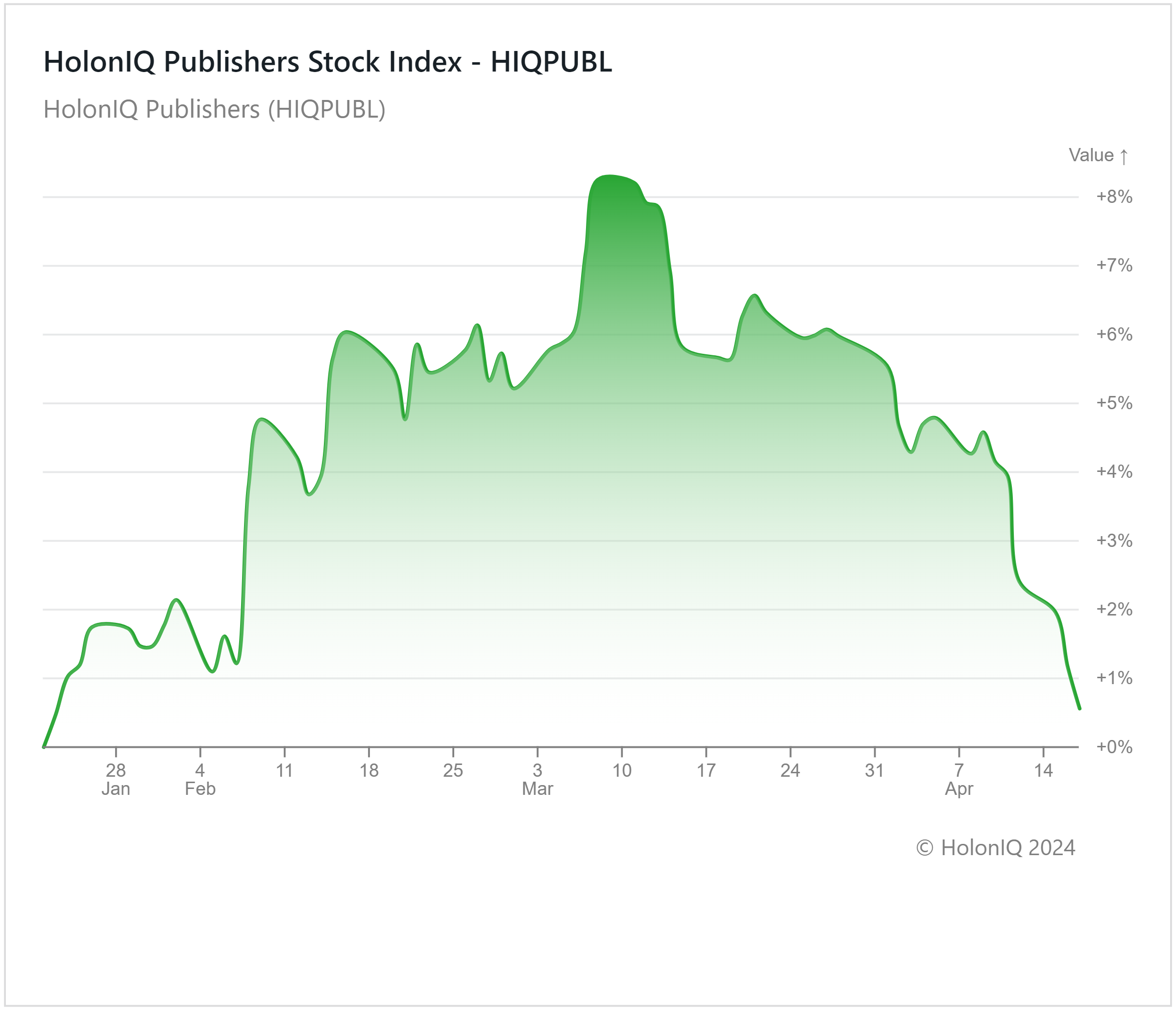 HolonIQβs publisher index retraced gains seen earlier in the quarter, now showing a gain of less than 1%. Significant stocks within the index, including News Corp. ($14B MCap), Informa Plc ($13B MCap), and Pearson Plc ($8B MCap), reported quarterly returns of 1%, 6%, and 5%, respectively. Yearly index gains have also been partially reversed during the quarter, currently settling at ~9%.
