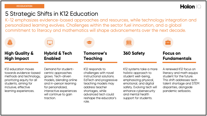HolonIQ identifies 20 strategic shifts shaping education's future, from early childhood to workforce training. Over the next decade, K12 education will prioritize high-quality approaches to address critical challenges and seek novel approaches for long-term impact. Technology integration and personalized learning will continue to evolve.