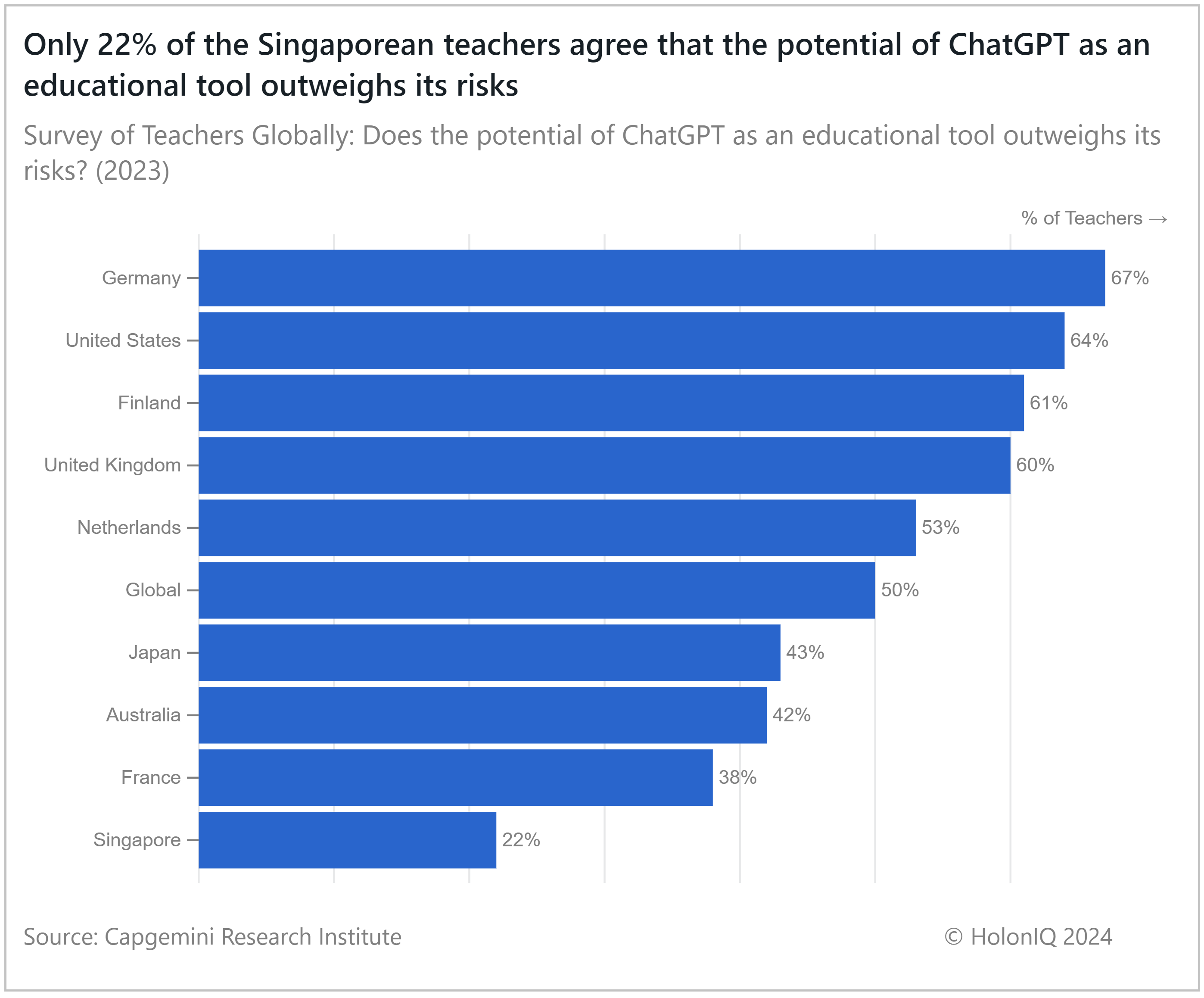Adoption patterns of innovations vary across regions, and attitudes towards technology can differ. This trend is evident in teacher attitudes towards ChatGPT, with a higher share of teachers in Germany and the US believing that its benefits in education outweigh its drawbacks. Conversely, only 22% of teachers in Singapore were in favor of employing ChatGPT as an educational resource.