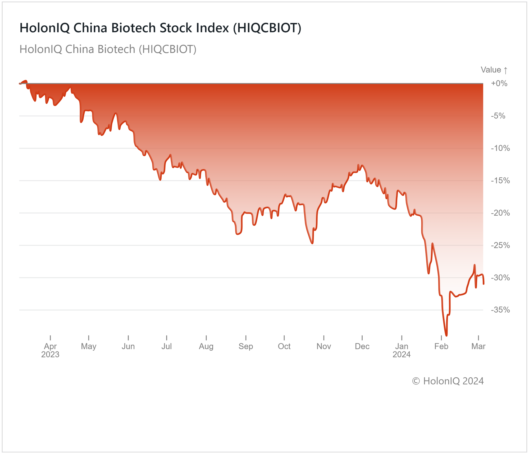 HolonIQ's China Biotech Index has declined 30% over the past year after reaching lows of 40% in February. Major stocks in the index have fallen over the last 12 months, including WuXi AppTec Co, which declined 37% ($23B MCap), BeiGene by 16% ($18B MCap), and Chongqing Zhifei Biological Products, which fell 13% ($17B MCap).