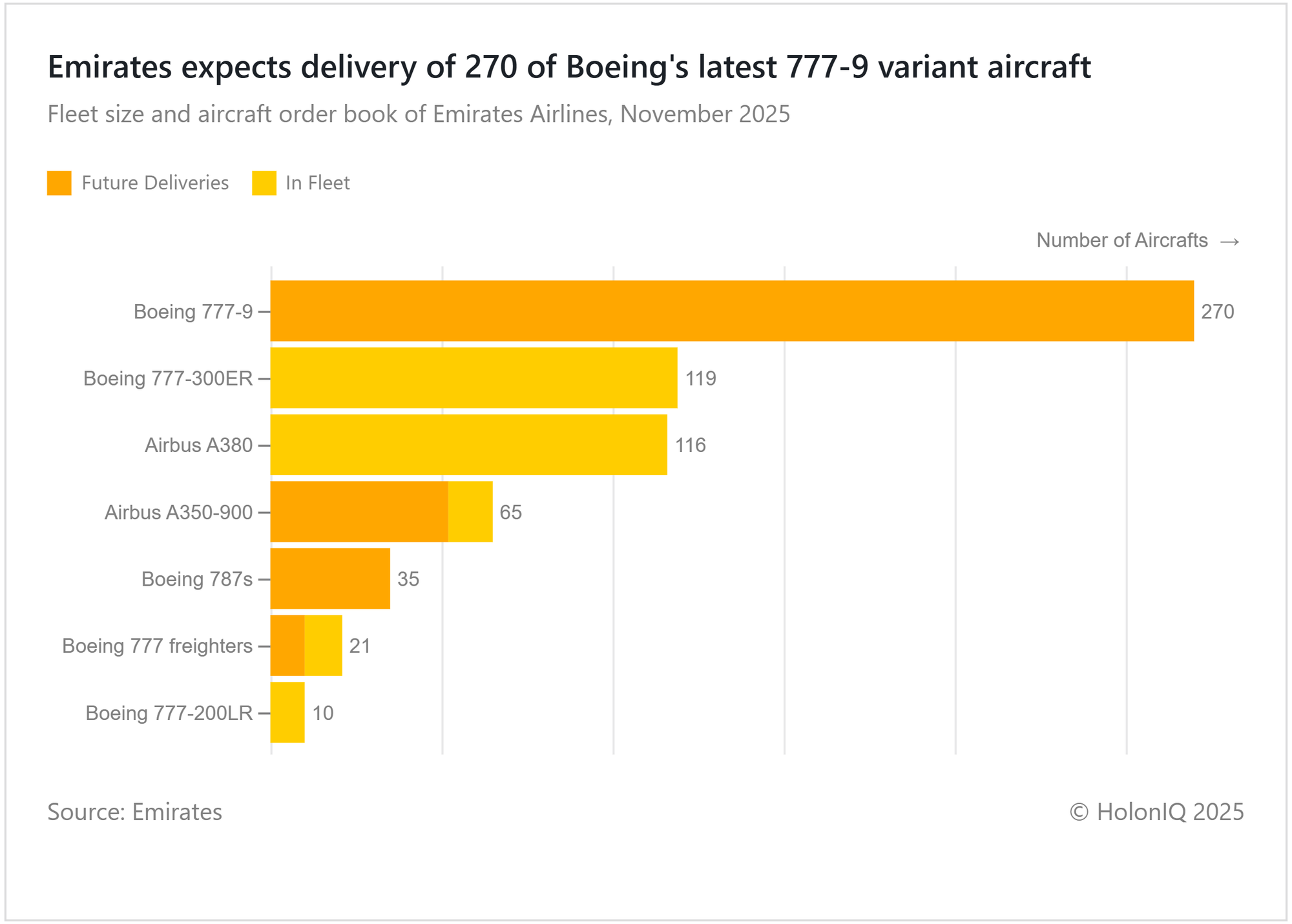 Emirates’ fleet plan shows a major pivot toward next-generation widebodies, highlighted by its new Dubai Airshow 2025 orders for the latest Boeing 777-9s. These additions aim to modernize the long-haul fleet and expand global capacity. However, ongoing certification delays for the Boeing 777-9 have forced the airline to reassess its expansion timeline, relying more heavily on interim A350 deliveries and existing 777-300ER, as well as A380 aircraft operations to maintain network growth, alongside the DWC airport expansion.