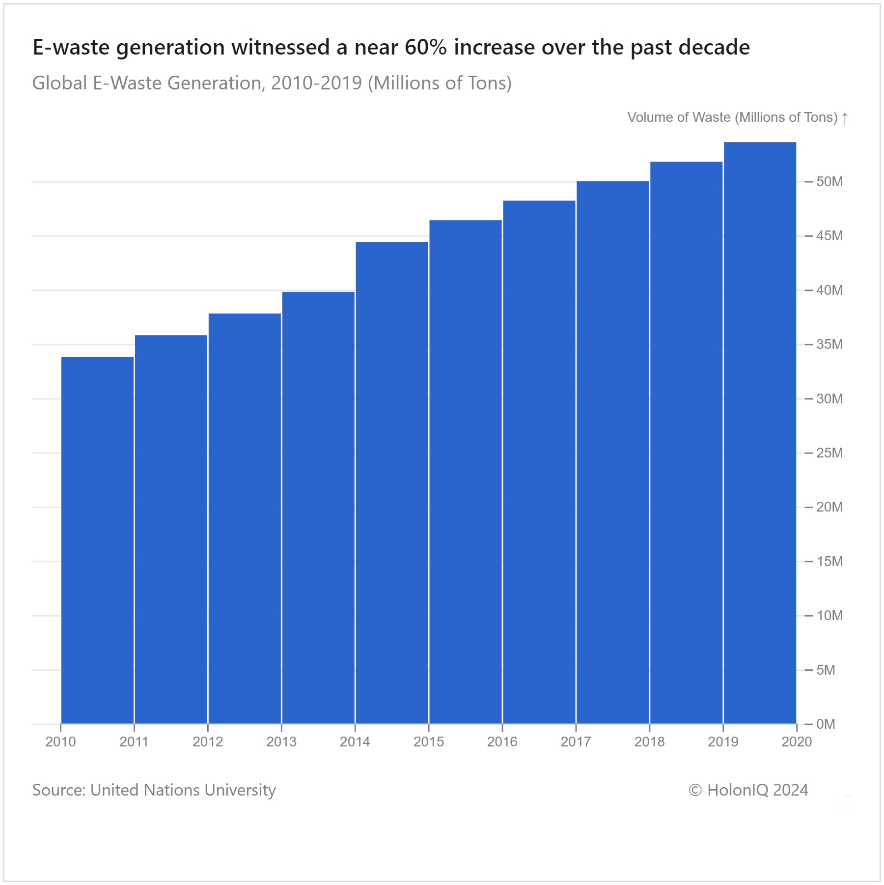 Over the past decade, global e-waste generation has risen by nearly 50%, marking a concerning trend that is poised for exponential growth in the foreseeable future, boosted by technological advances. This is fueled by the ever-increasing adoption of technology, resulting in a constant influx of new devices flooding markets each year as consumers eagerly embrace the latest tech innovations, leading to faster product turnover rates and hence the lifespan of electronic products shrinking. Economic powerhouses such as China, the USA, and India are among the largest producers of e-waste. E-waste presents an opportunity for companies like Apple, Dell, and Amazon to unlock value through efficient waste management practices.