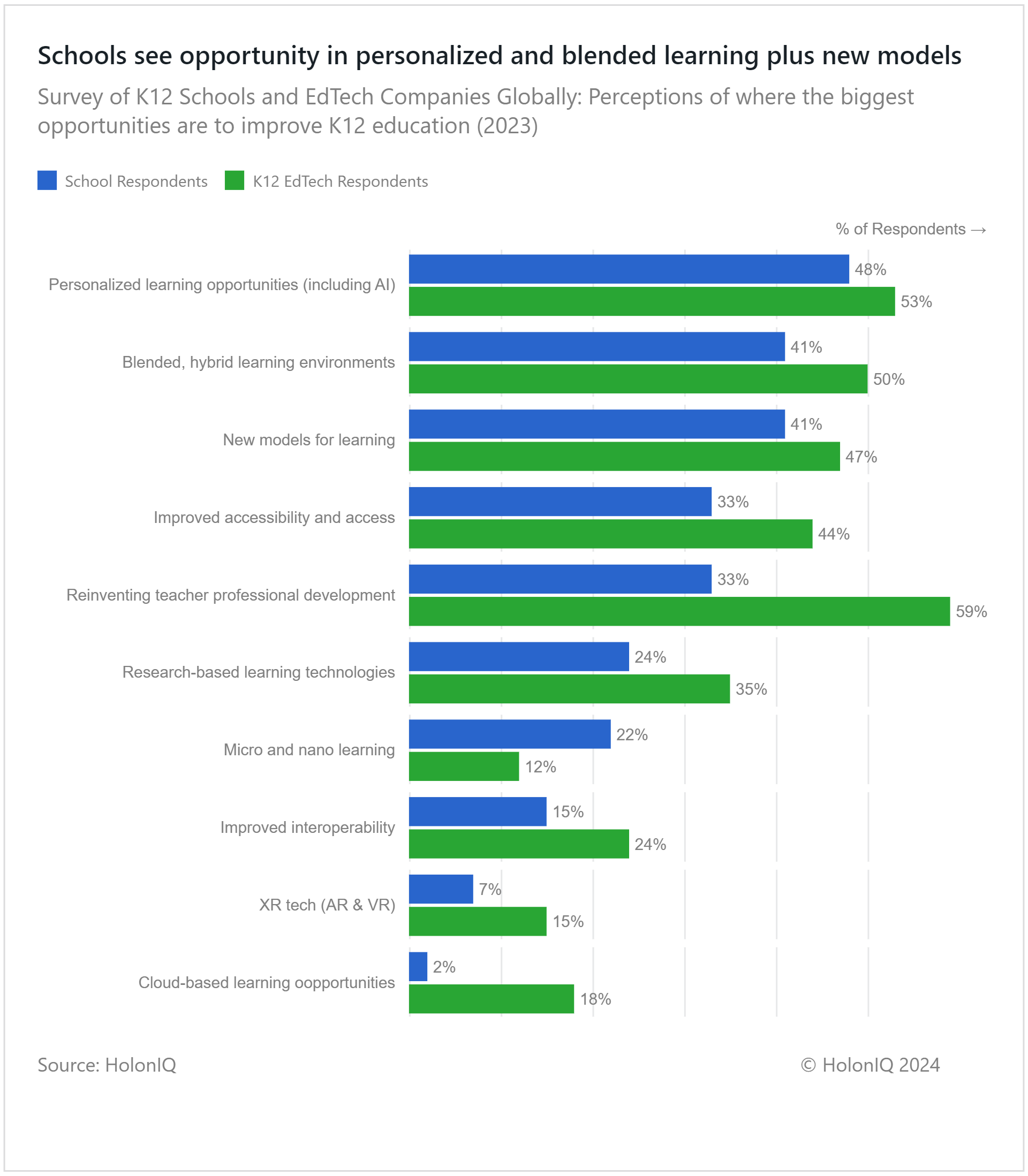 Learning recovery is driving K12 digital innovation, and the spotlight is on solutions that enhance learning experiences and outcomes. Based on HolonIQ's 2023 K12 Digital Transformation Survey, schools and EdTech companies see personalized learning as the greatest opportunity to improve K12 education.