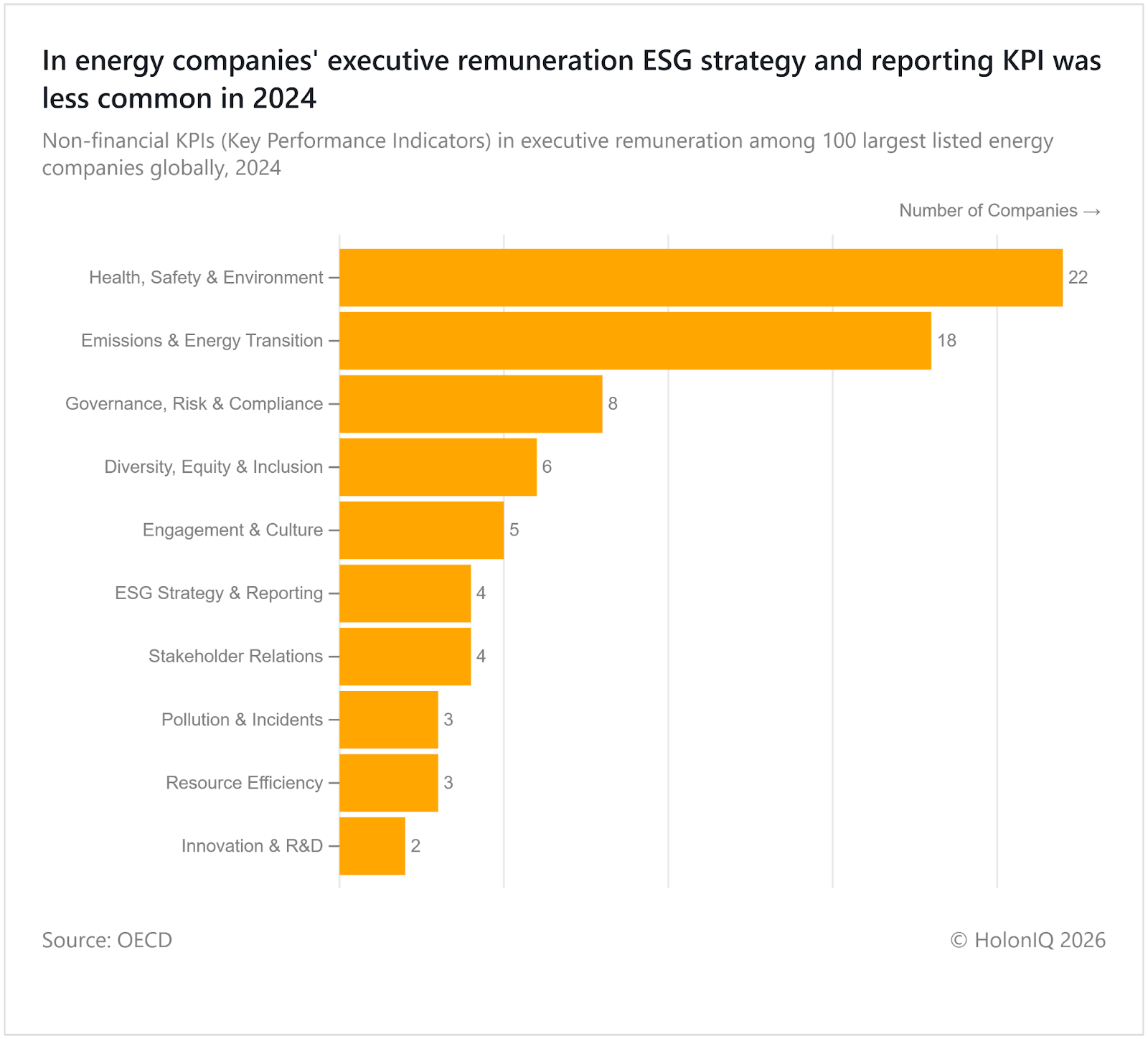 Energy companies are increasingly linking executive pay to non-financial measures beyond profit. Health, safety, and environment and emissions targets are the most common factors, while ESG strategy and reporting appear far less frequently. Non-financial KPIs in executive pay mean bonuses depend on goals beyond profit, such as emissions or safety. ESG strategy is lower as it is harder to measure directly. The OECD Principles of Corporate Governance promote linking remuneration to long term sustainability goals.
