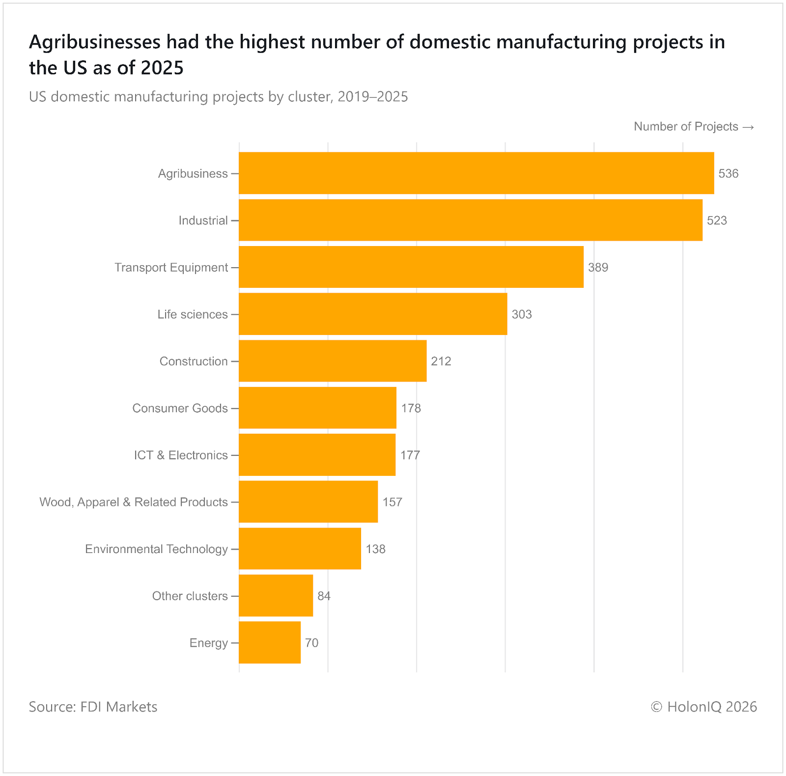 US domestic manufacturing projects reached over 2,500 between 2019 and 2025, with agribusiness leading at nearly 540 projects. This shows strong momentum in food processing and agricultural supply chains. High agribusiness investment reflects demand for food security, rural job creation and resilient domestic production. Smart farming connects agribusiness to advanced manufacturing by using sensors, data analytics, and automated machinery in production. The Inflation Reduction Act implemented by the US Department of the Treasury supports domestic production and supply chain resilience.