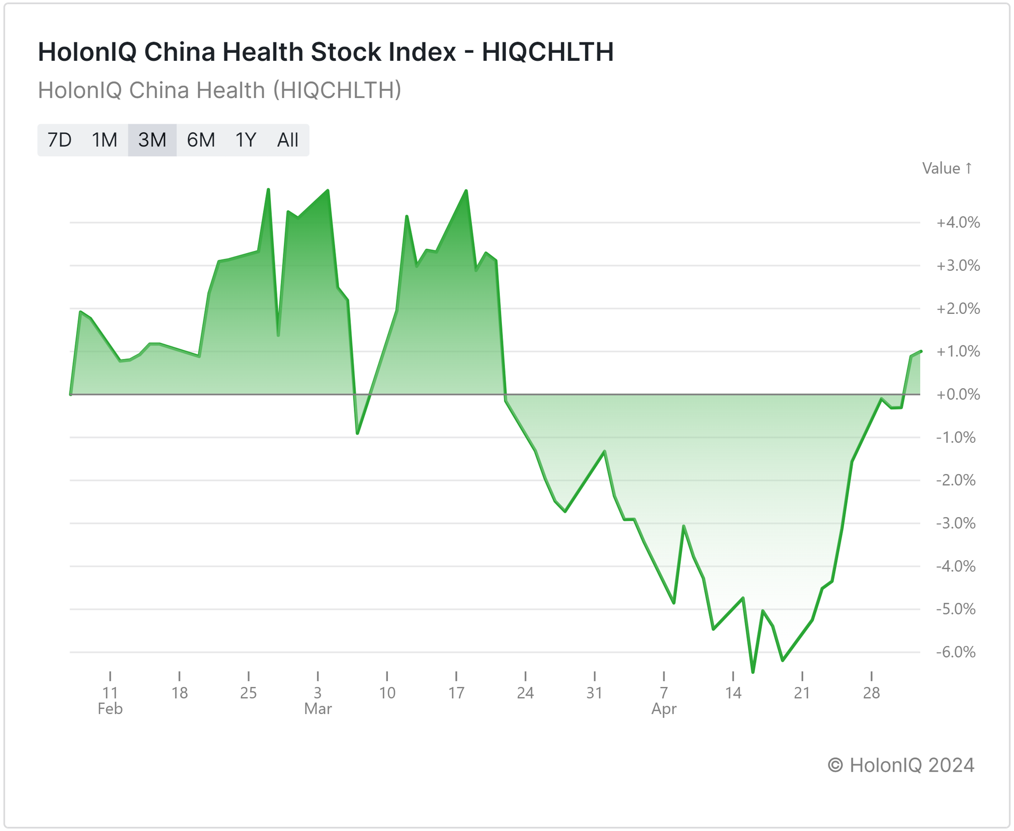 HolonIQβs China Healthcare index experienced fluctuations over the past three months, with an overall positive trend in the first two months and a downturn in A pril. Despite this volatility, the sector has rebounded by 1% from the decline observed in mid-April. These fluctuations have been attributed to various factors, including strains from the global health crisis, economic disruptions, and policy challenges. Economic uncertainties, supply chain disruptions, and trade tensions have impacted the availability and affordability of essential medical supplies, medications, and equipment.