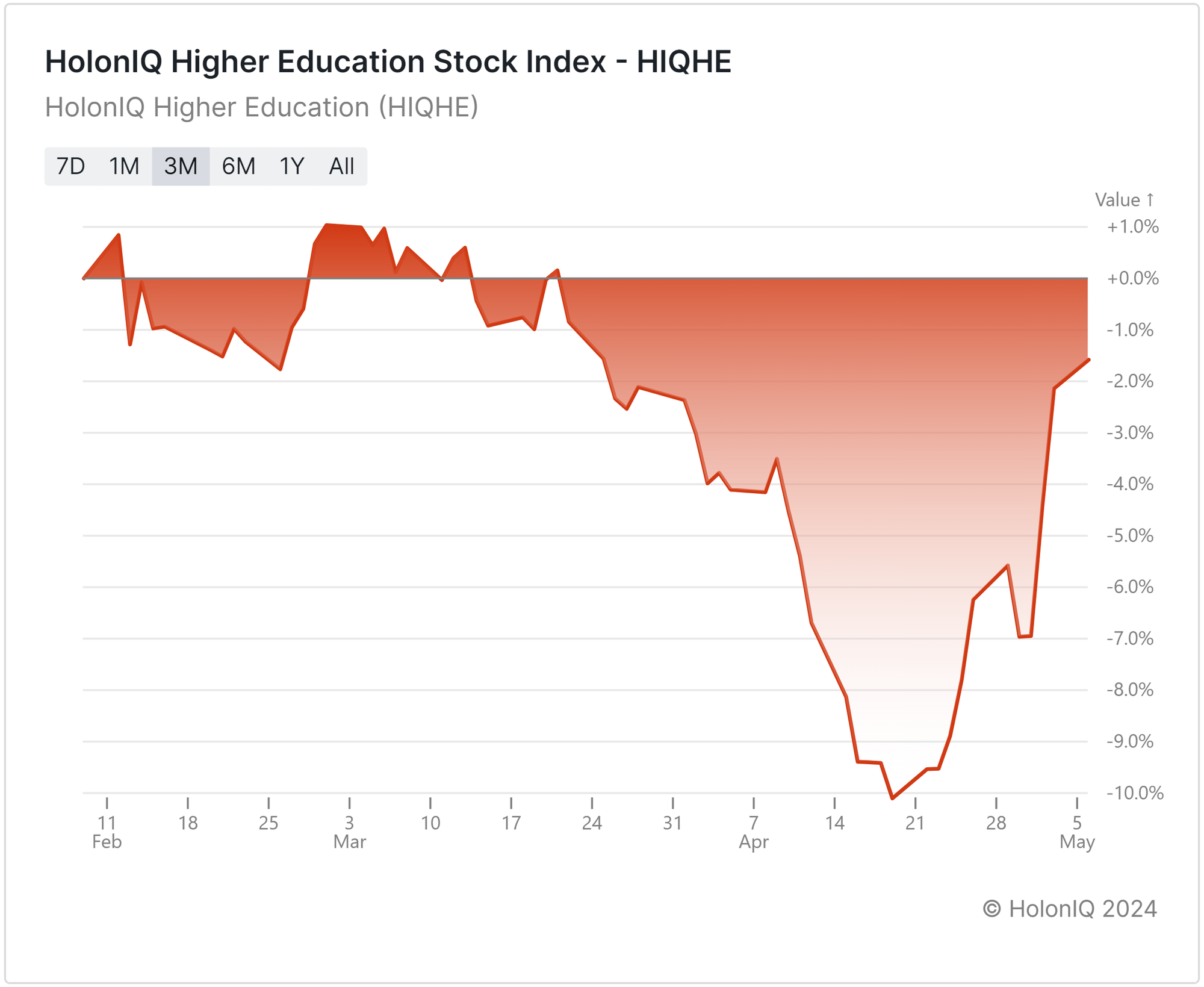 HolonIQβs Higher Education index staged a recovery by December 2023 after a rough first half of 2023, although some of these gains have been eroded in 2024. Despite an overall decline this year, there were signs of improvement in late April, with a partial recovery from a 9% drop. Strategic Education ($3B MCap) demonstrated a 3M return of 24%, driven by their Q1 earnings. Their earnings report released this April showed revenue growth of 13.1%. IDP Education's ($3B MCap) stock price declined by 18% due to increased competition as students applying to Canadian universities now have additional test options alongside IELTS. In comparison, other major stocks within the index, such as CAE Inc. ($6B MCap) and Grand Canyon Education ($4B MCap) saw only moderate movements within the quarter. Despite labor market challenges and economic uncertainties, academic institutions are restructuring their strategies to integrate online programs & AI into their services. This shift has the potential to improve the index in the long term.