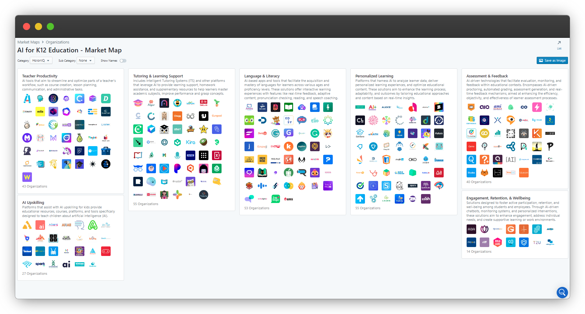 These trusted infrastructures are still developing, along with teacher capability in the use of AI. While these guidelines are emerging, AI-based EdTech solutions abound across the entire learner lifecycle, with significant capital funding being channeled into AI EdTech solutions in areas such as teacher productivity, assessment & feedback, tutoring & support, and AI upskillingβHolonIQ's AI in K12 market map helps unpack the latest in this dynamic market.
