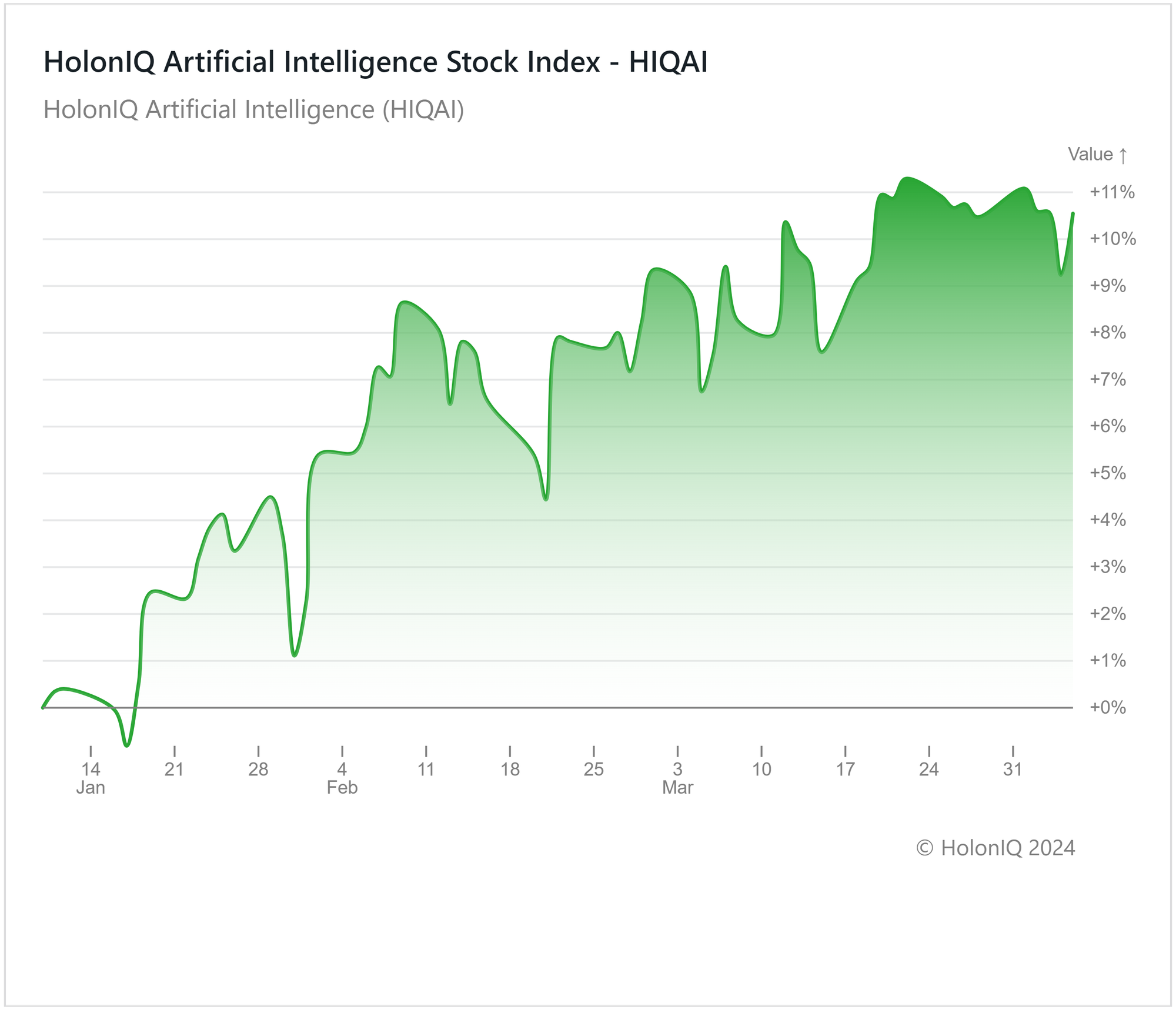 HolonIQ's Artificial Intelligence index experienced an 11% increase last quarter, maintaining the upward momentum that has helped yearly returns reach 50%+. Major stocks in the index, including Microsoft Corp ($3T MCap), NVIDIA Corp ($2T MCap), and Amazon ($2T MCap), experienced increases of 13%, 64%, and 21%, respectively. The HIQAI outperformed the S&P500, which returned ~29% over the past year.