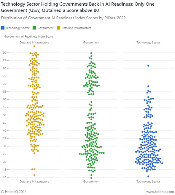 The “Government AI Readiness Index Scores, 2022' addresses how ready a given government is to implement AI in the delivery of public services to its citizens. The latest data reveals a concerning trend; The technology pillar's influence impedes progress, with the USA being the sole government scoring above 80 in a pool of 181 global giants.