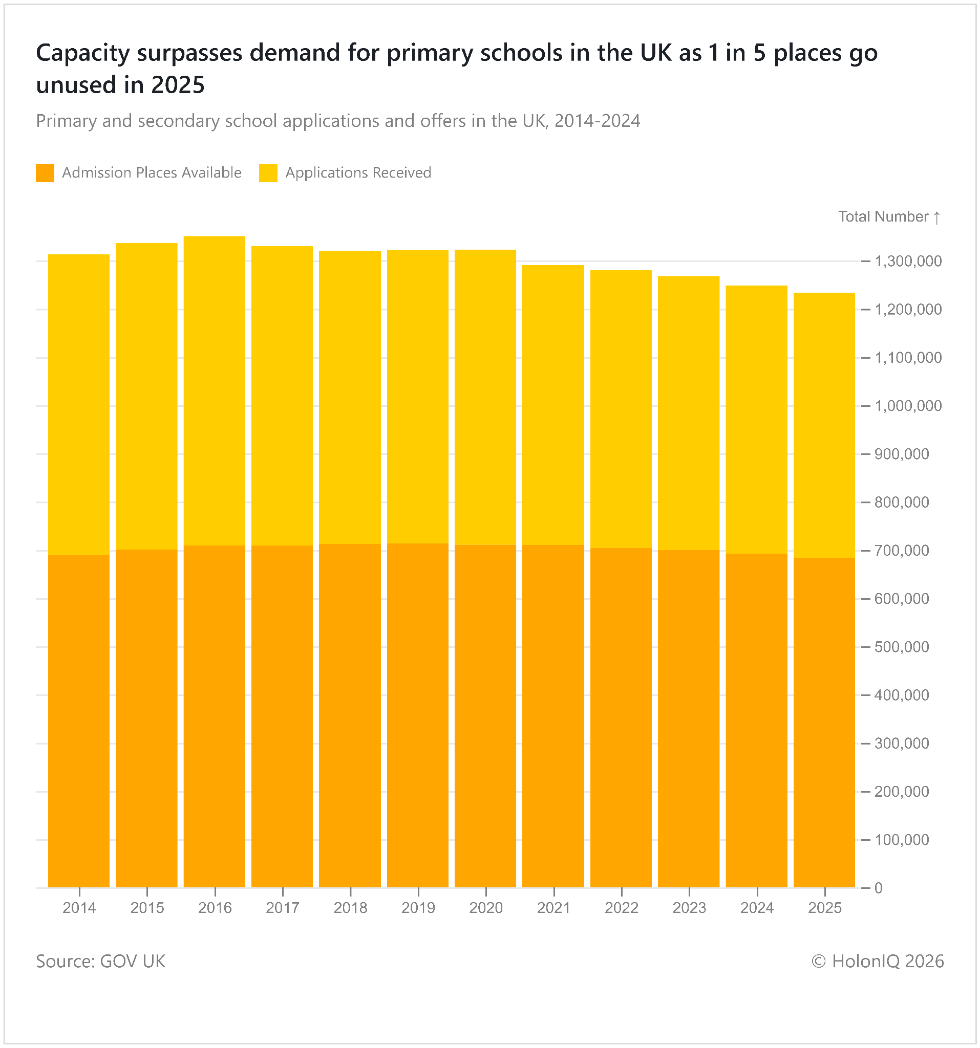 Admission places in the United Kingdom declined to over 680K in 2025, while applications fell faster to over 550K, leaving a widening gap. Persistent surplus capacity remains an issue, with roughly one in five school places unfilled. The data reflects declining birth rates and shifting local demographics, reducing pressure on school admissions. Maintaining underused infrastructure raises cost and staffing challenges for districts. The School Capacity Survey, led by the UK Department for Education, guides long-term planning and resource allocation.