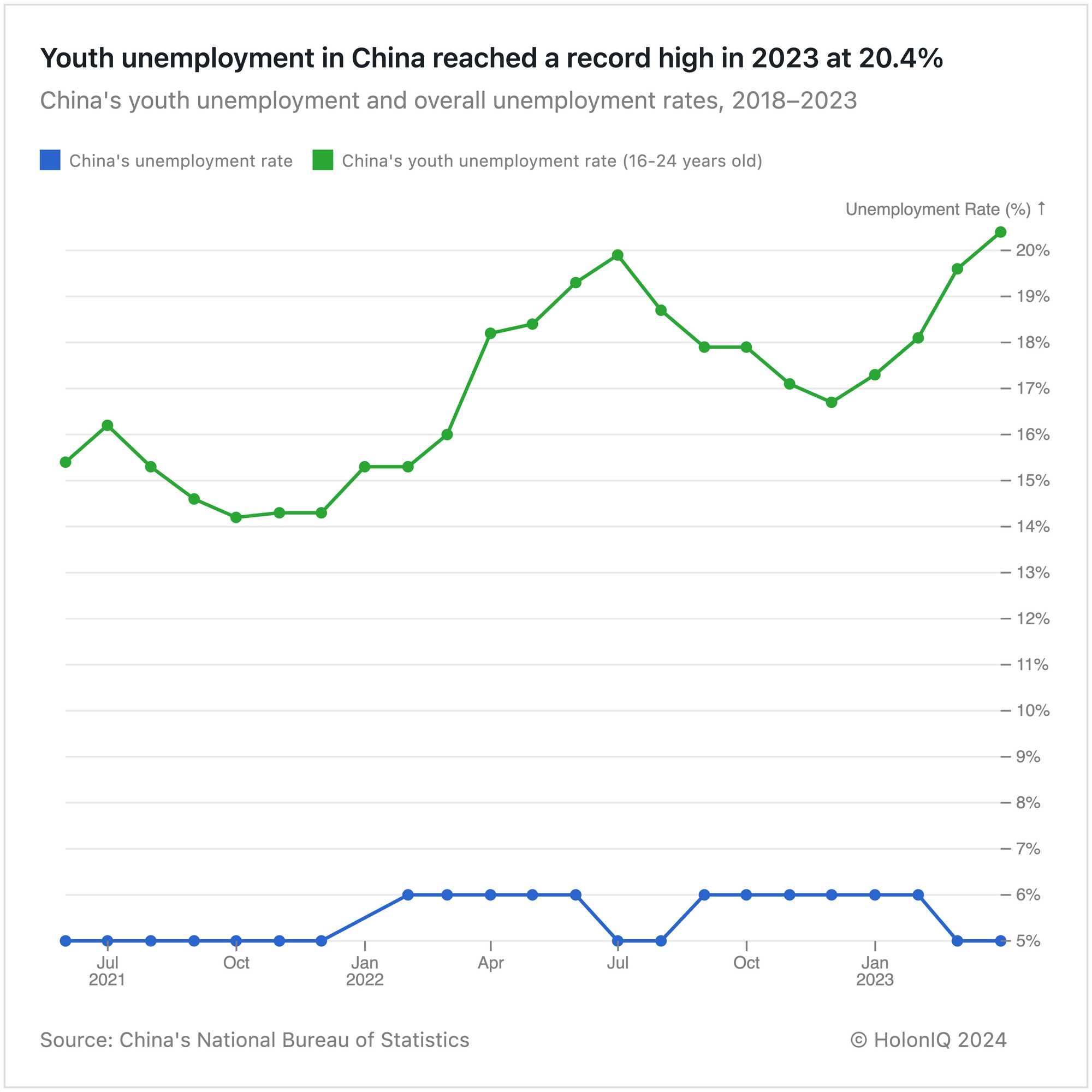 ๐ Chart spotlight - Youth unemployment in China reached a record high of 20.4% in 2023