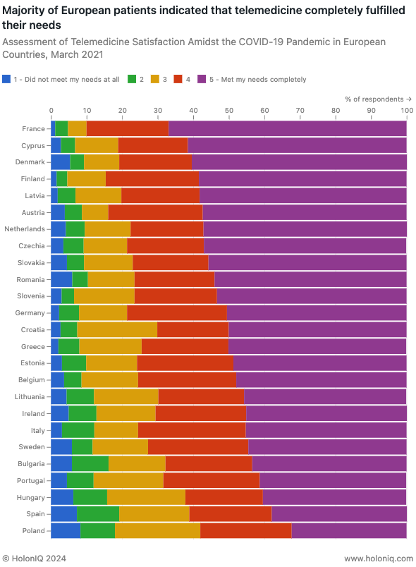 The majority of patients across Europe indicated that telemedicine effectively met their healthcare needs, with complete satisfaction levels ranging from 32% to 66.9%. Notably, countries such as France, Cyprus, Denmark, and Finland reported particularly high satisfaction rates, emphasizing the integral role telemedicine played in fulfilling diverse healthcare requirements amidst the challenges posed by the COVID-19 pandemic.