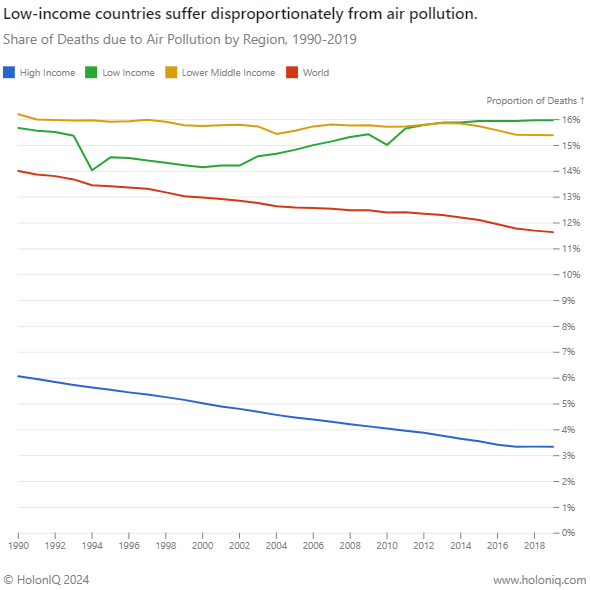 Nearly 16% of deaths in Low-income and Lower-middle-income countries are from air pollution, four points higher than the global average, while high-income nations only face a 3% proportion of air pollution-related deaths. Air pollution has worsened in the last century due to industrialization, urbanization, and fossil fuel reliance. Nearly all of the population globally faces elevated health risks, including heart disease, stroke, respiratory issues, cancer, and pneumonia due to exposure to compromised air quality.