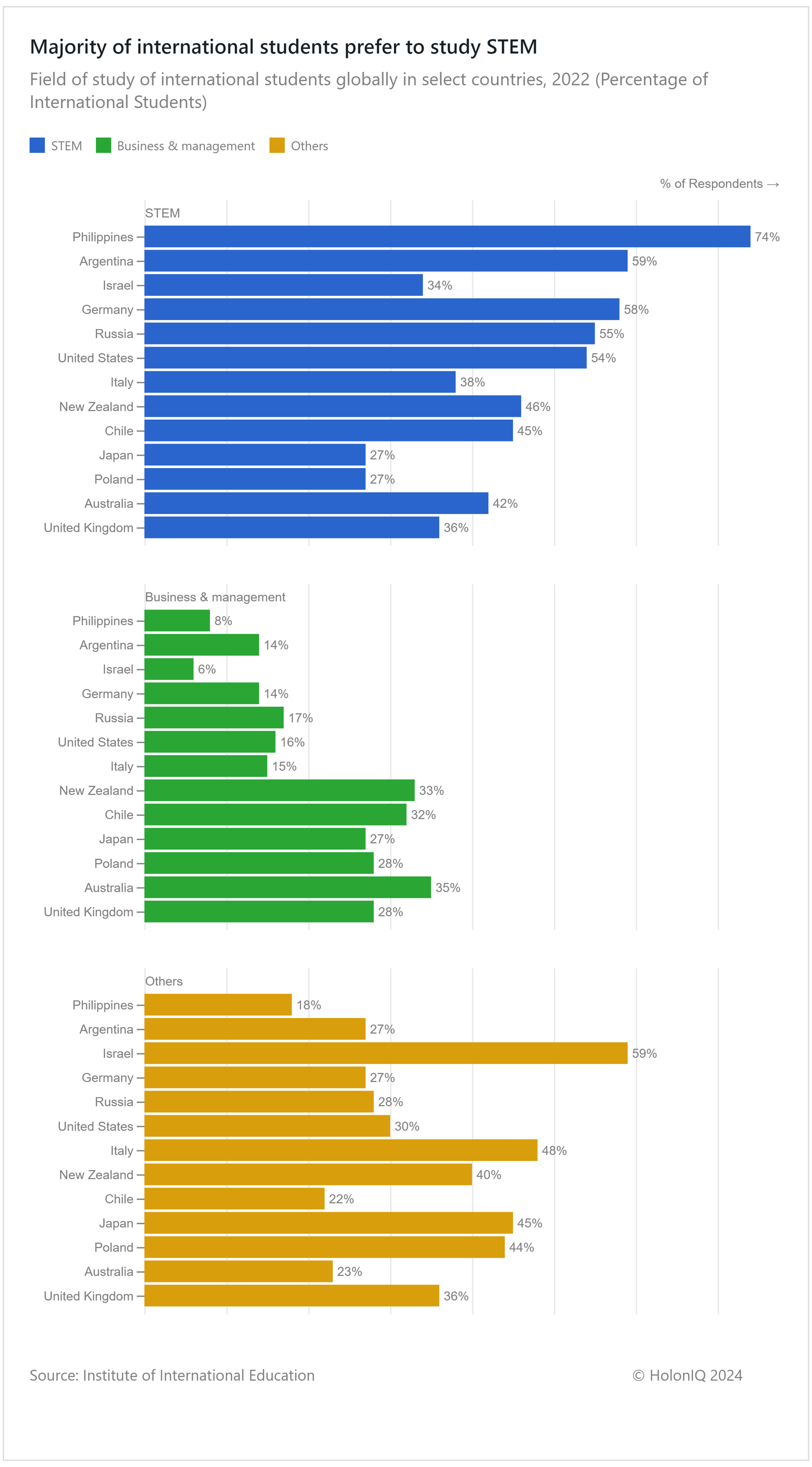 The field of study predominantly chosen by international students was STEM, with a significant proportion of students in countries like the Philippines (74%), Argentina (59%), Germany (58%), and the United States (54%) pursuing degrees in these disciplines. This inclination can be attributed to the demand for STEM skills which are highly valued in the job market across diverse fields. Competencies like problem-solving, analytical thinking, and data manipulation are highly valued by employers across industries, with science majors in science-related roles earning roughly 30% more than those in unrelated fields.