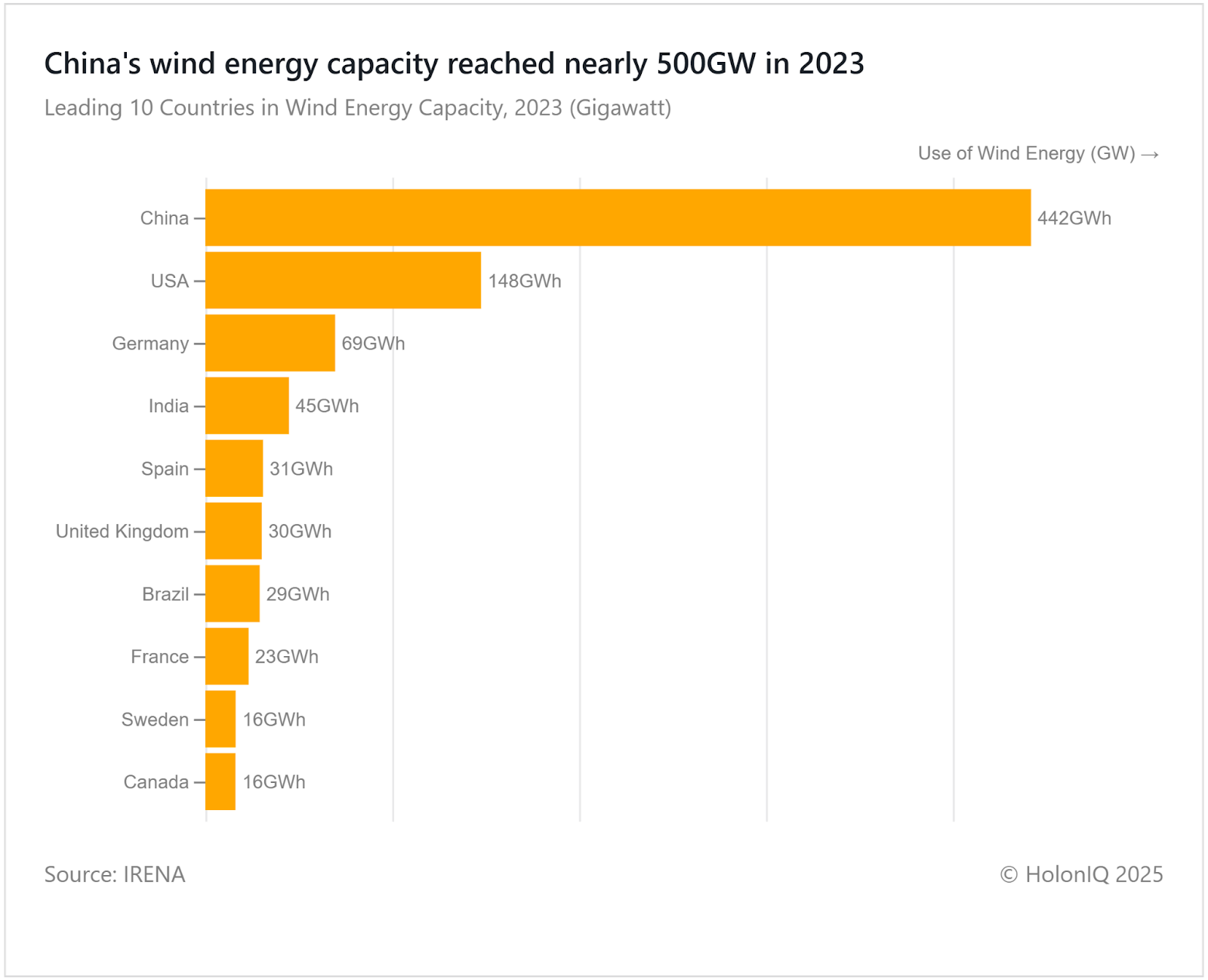 Global wind energy capacity is led by China in 2023, followed by USA and Germany. This reflects how both advanced economies are scaling renewables. The spread across Asia, Europe and the Americas highlights how wind has become a mainstream pillar of national energy mixes. Countries investing heavily in engineering talent, technical institutes and green skills programs are strengthening the workforce needed to expand wind infrastructure, supported by national energy ministries.