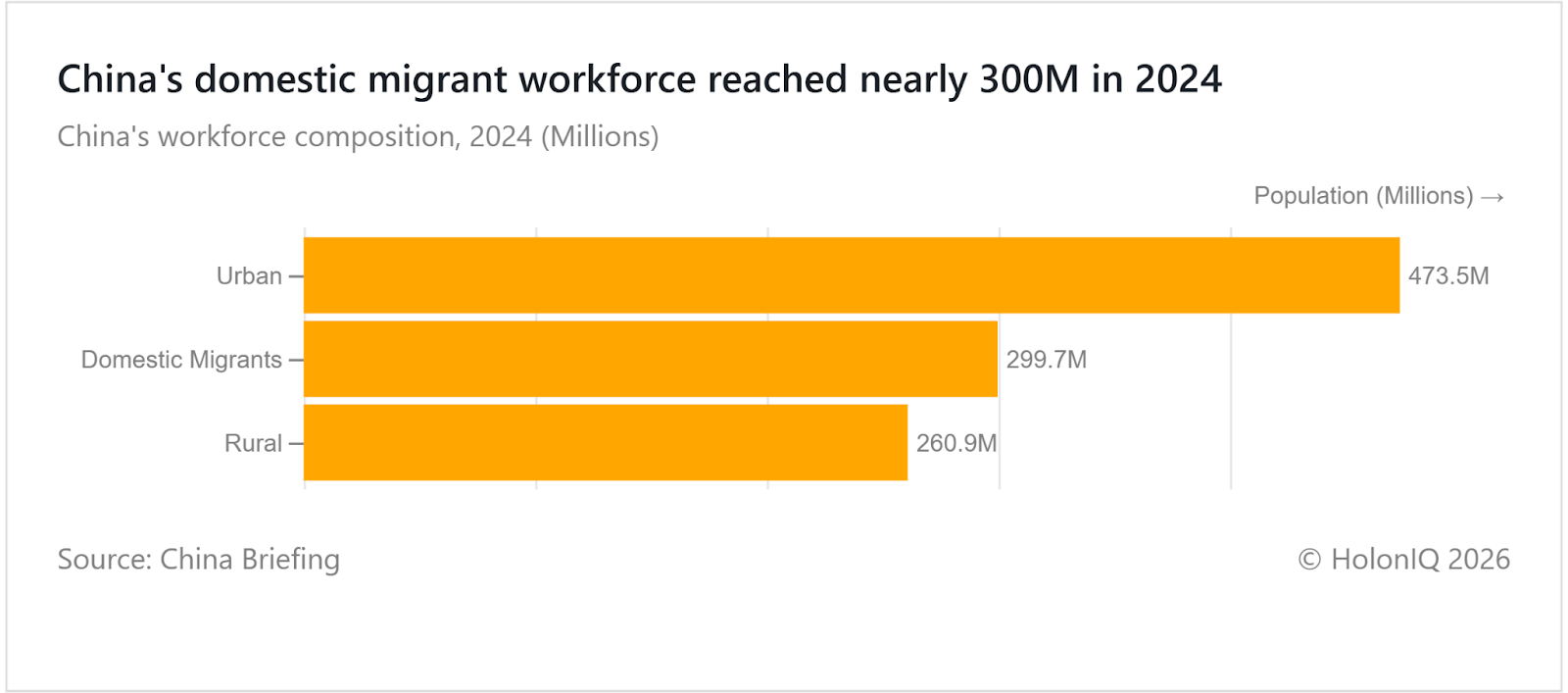 China’s domestic migrant workforce reached nearly 300M in 2024, supplying labour for manufacturing, construction, and logistics and supporting the country’s industrial output. This large “floating population” has historically enabled rapid industrial and urban growth in China. However, many migrant workers face limited access to public services such as healthcare and education in the cities where they work due to household registration policies. Overall, the system highlights both the economic importance of mobile labour and ongoing challenges related to migration management, labour conditions, and productivity.