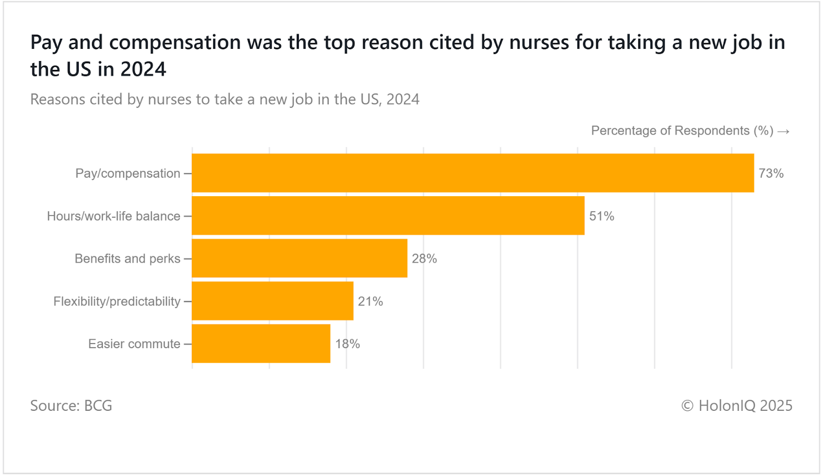 In 2024, 73% of US nurses cited pay and compensation as the main reason for changing jobs, highlighting a growing mismatch between rising healthcare demand and stagnant wages. This churn is worsening staffing shortages, especially in hospitals and long-term care. This shortage has become an avenue for overseas health professionals to enter the country and gain residency as well. Federal responses include CMS workforce funding and state-level retention bonuses, but uneven pay growth continues to strain care delivery and system capacity.