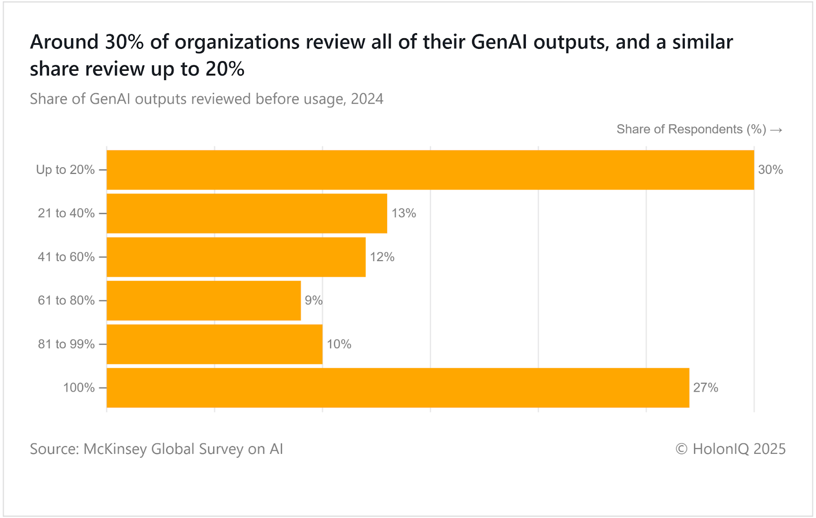 Organisations showed polarised GenAI output review in 2024, with 30% reviewing all outputs versus 27% reviewing none. Critical gaps persist due to a lack of organisational policies on AI and a lack of proper review frameworks. Universal frameworks emerged, such as NIST AI Risk Management Framework, EU AI Act, emphasising output validation, monitoring, and transparency. Organisations struggle with GenAI's "black box" nature in critical sectors, requiring cross-functional governance balancing innovation with accountability through risk-based frameworks.
