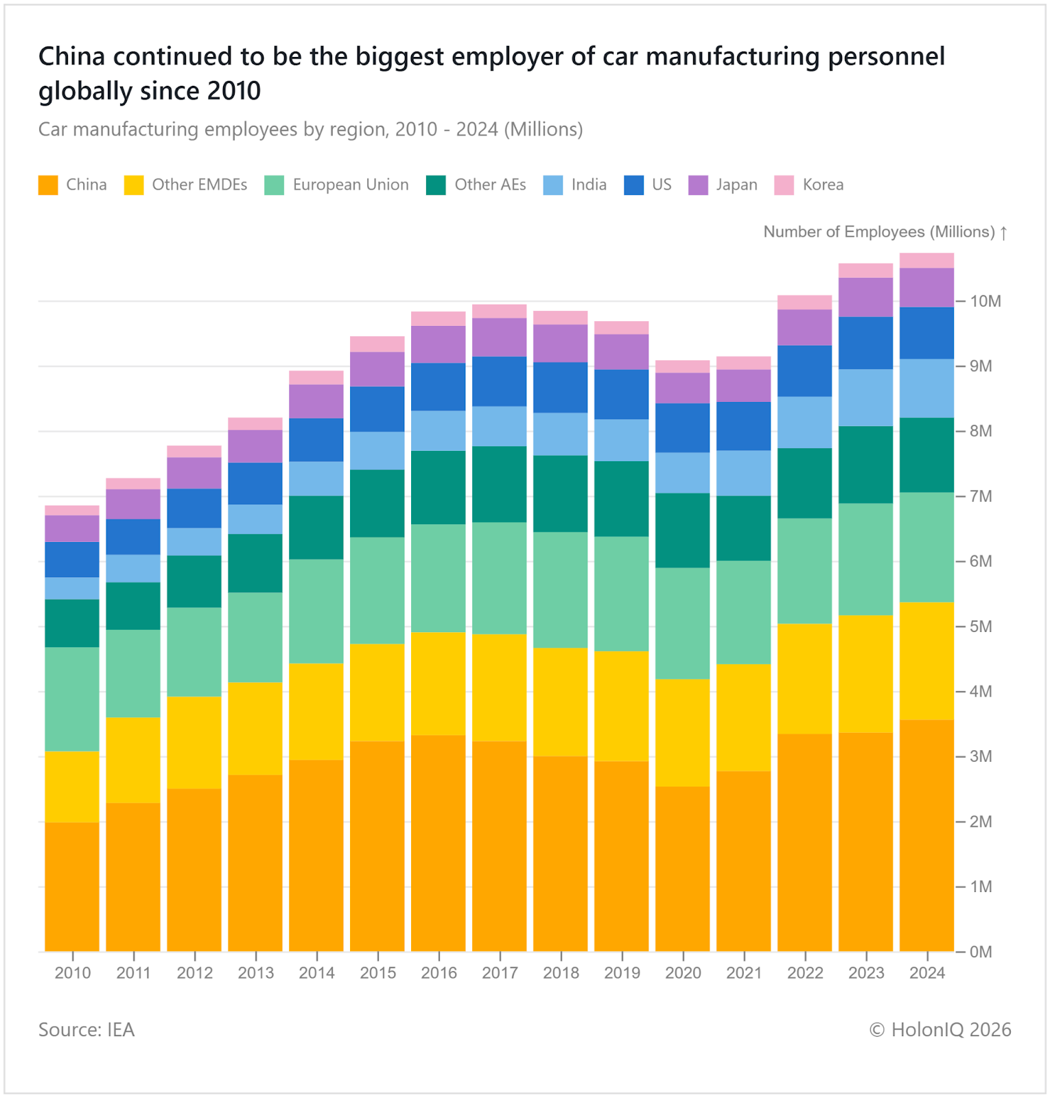 Between 2010 and 2024, Chinaβs car manufacturing workforce grew from 2.0M to over 3.5M, outpacing traditional hubs like the US and Europe. Rapid scale has been China's biggest advantage, and it is driven by large domestic demand, government industrial support, and dominance in EV production. Meanwhile, traditional markets face ageing plants, labour constraints, and slower EV adoption among many challenges in adapting, affecting global competitiveness and innovation while shifting focus to new markets.