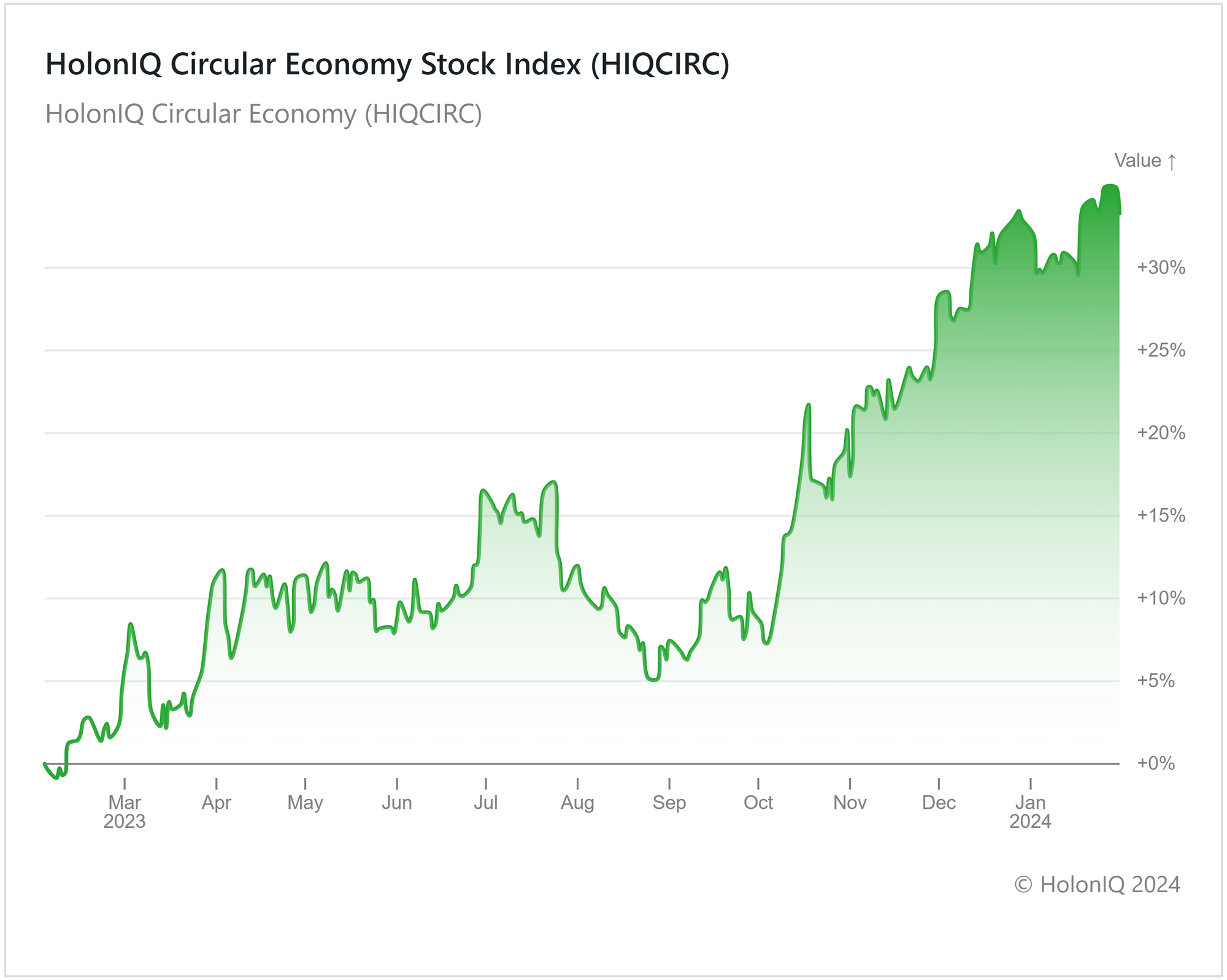 HolonIQ Circular Economy (HIQCIRC). 12-month Indexed returns (returns on the index relative to the level on February 02, 2023) have been on a general upward trend, increasing to 35% YoY in January 2024.