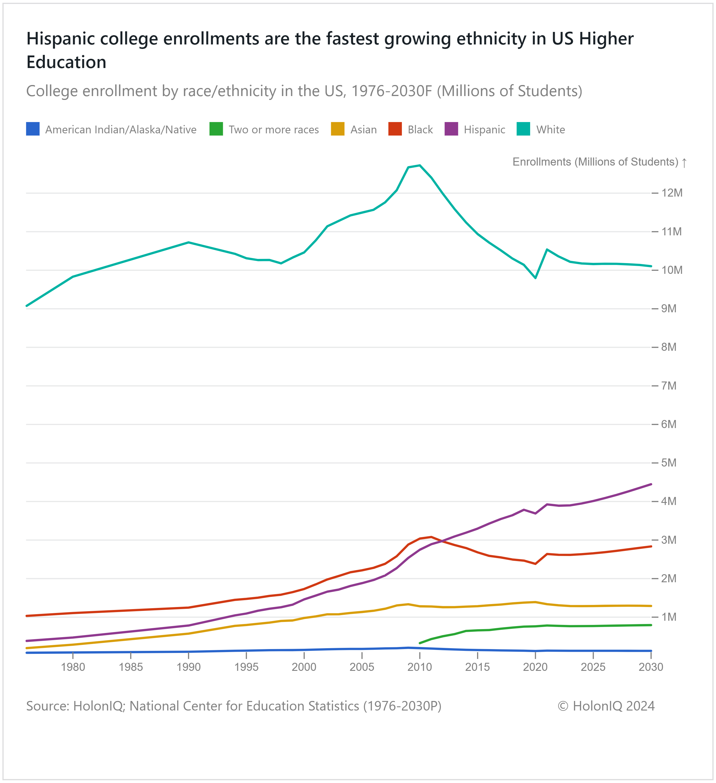 The college enrollment landscape witnessed a shift in 2010, where White student enrollments fell for the first time since the turn of the century. Since then, there has been a 20% decline in White student enrollments, reaching 10M students by 2023.