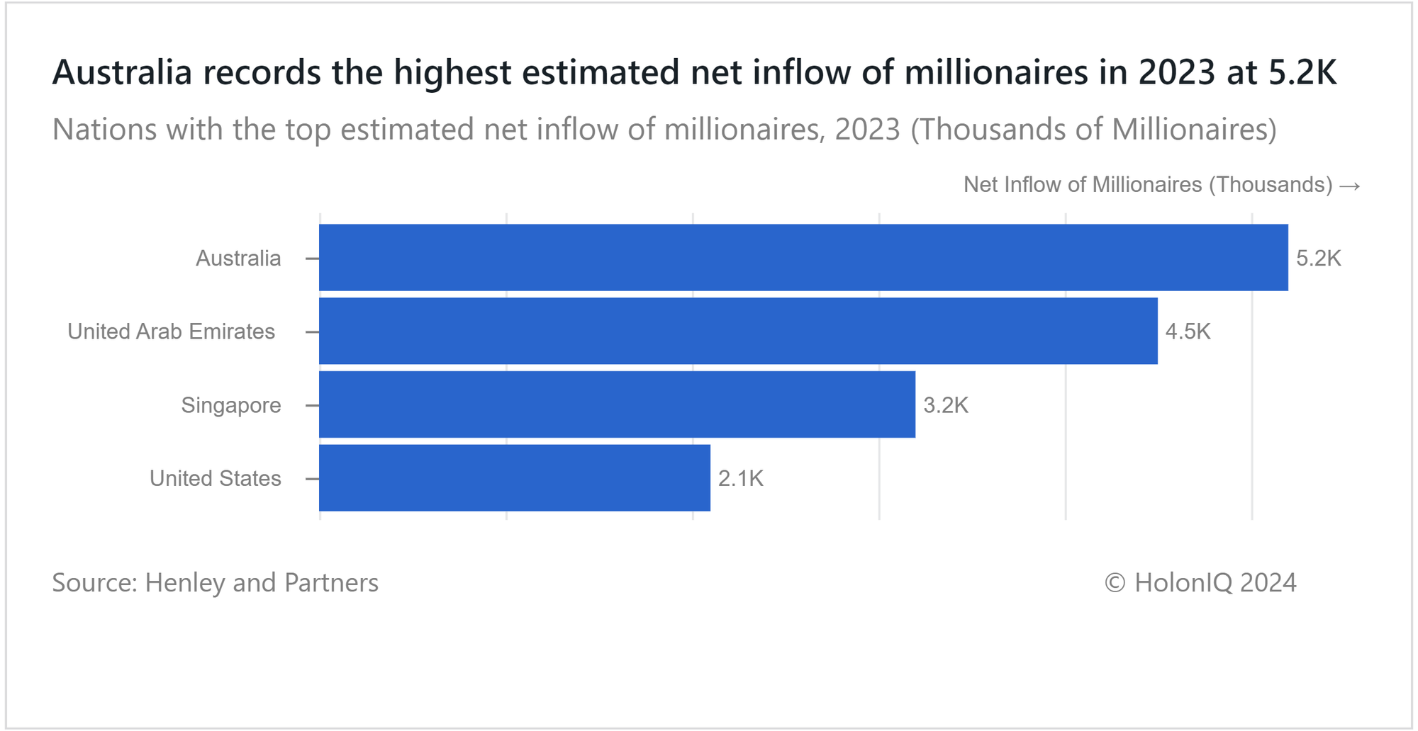 Australia emerges as the top destination for migrating millionaires in 2023, welcoming an estimated net influx of 5,200 millionaires. The country's appeal likely lies in its high quality of life, advanced economy, and excellent healthcare and education opportunities. While migrants predominantly originate from Asia and Africa, there has been a recent increase in migrants from high-income nations like the UK.
