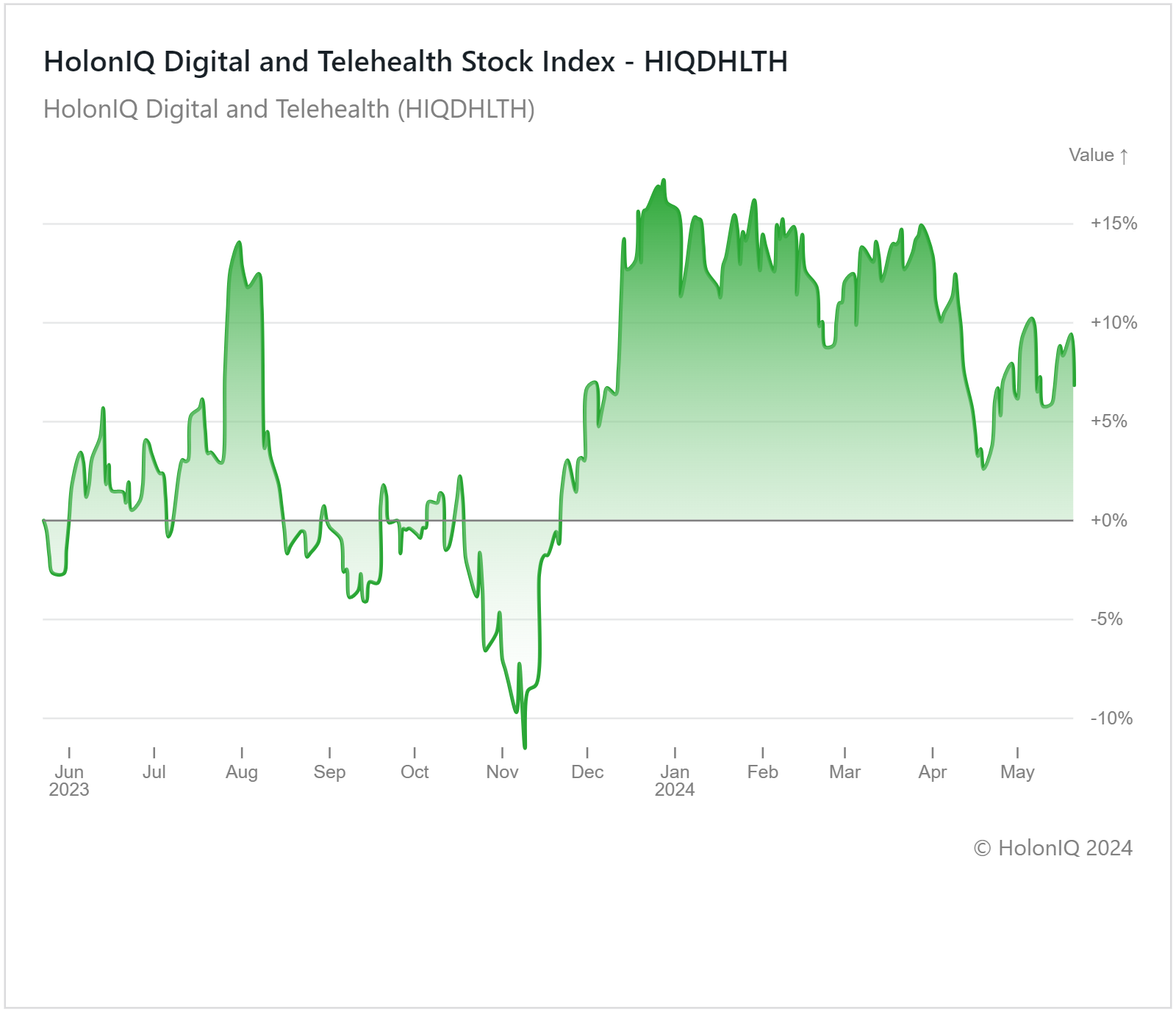 HolonIQ's Digital and Telehealth Index dropped to -12% in November 2023 but experienced a robust recovery in December 2023 and has maintained its positive trajectory. Over the past 12 months, the index has risen by 7%. While the onset of the pandemic accelerated telehealth adoption, it slowed down after the world adapted to the new norm. However, the sentiment on telehealth began to shift in 2023 as healthcare providers and patients began to realize the potential of digital and telehealth solutions.
