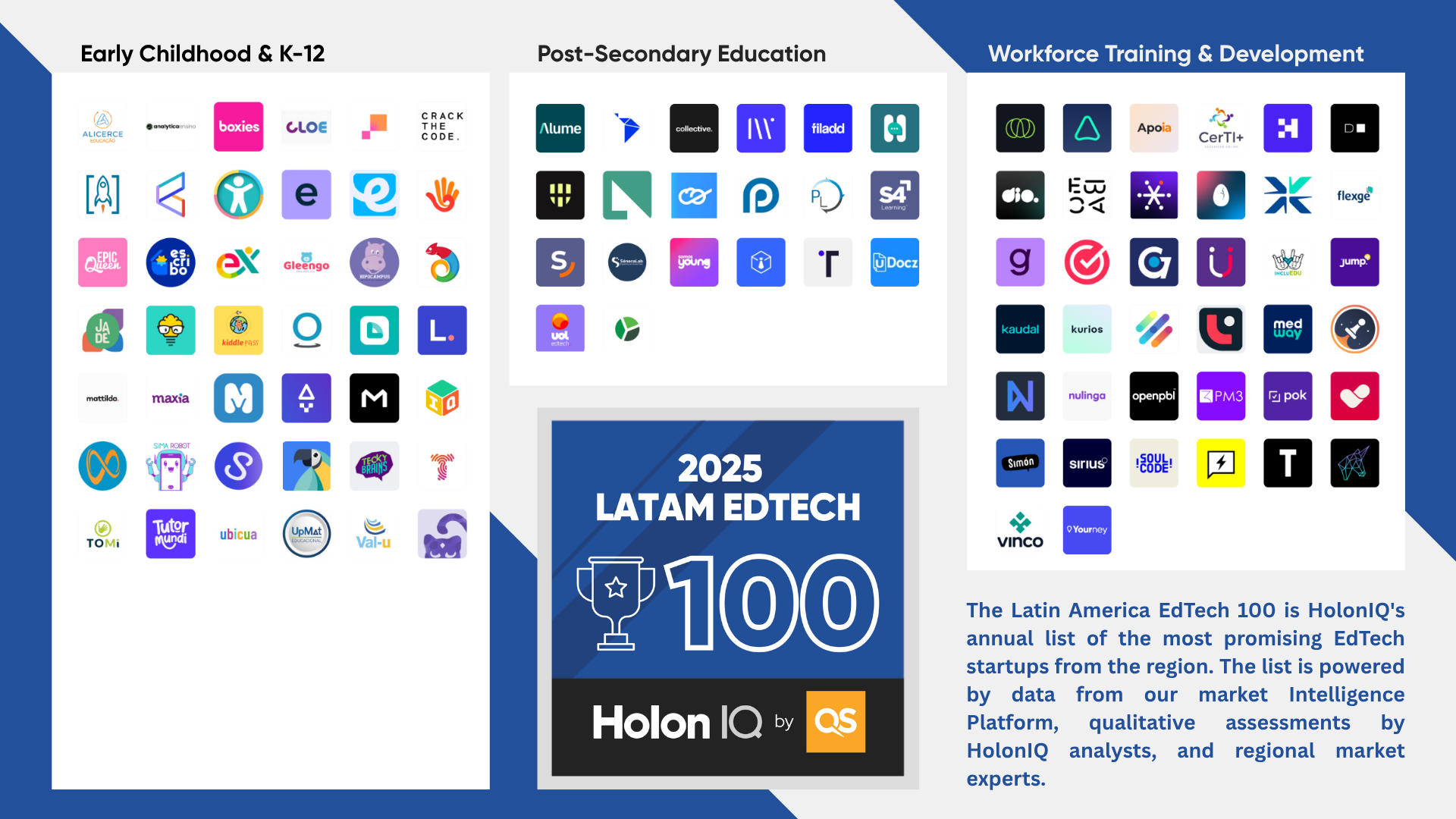 The 2025 Latin America EdTech 100 highlights the region’s most promising startups in education technology, and this year’s cohort reflects a dynamic but maturing ecosystem strong in Workforce and K-12, where systems, support, and skills remain central. While the market continues to prioritize scalable solutions, a younger generation of startups is beginning to emerge—signaling the early stages of a new innovation cycle.
