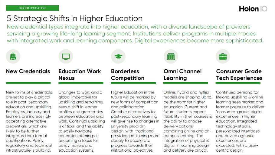 The Five Strategic Shifts in Higher Education illustrate how this convergence is taking shape. Converting credentials and capability to digital delivery and lifelong learning, they signal a system moving from education access to career and civic readiness.