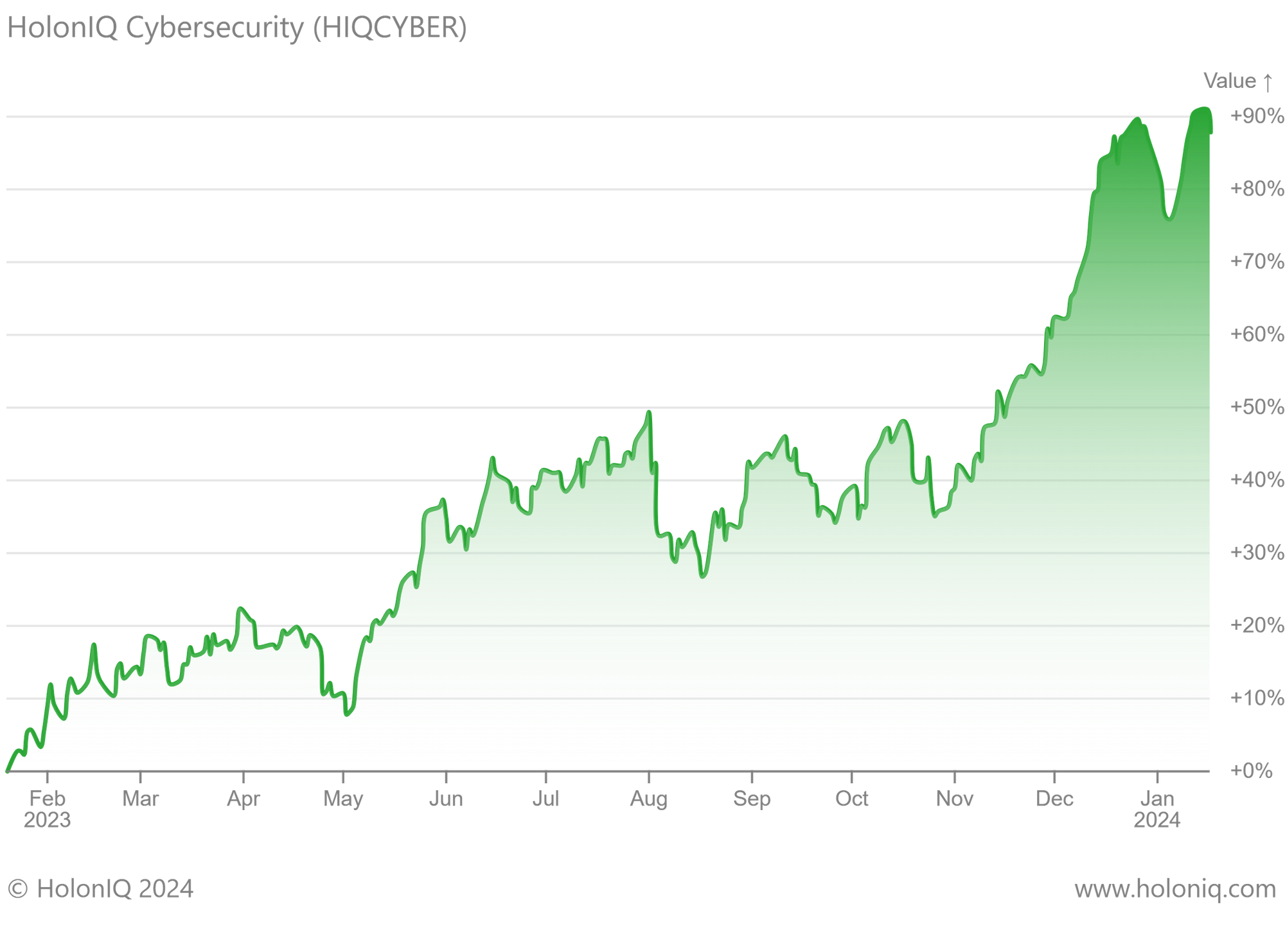HolonIQ Cybersecurity (HIQCYBER). In 2023, 12-month returns peaked in December (returns on the index relative to the level on January 20, 2023), increasing by almost 90%.