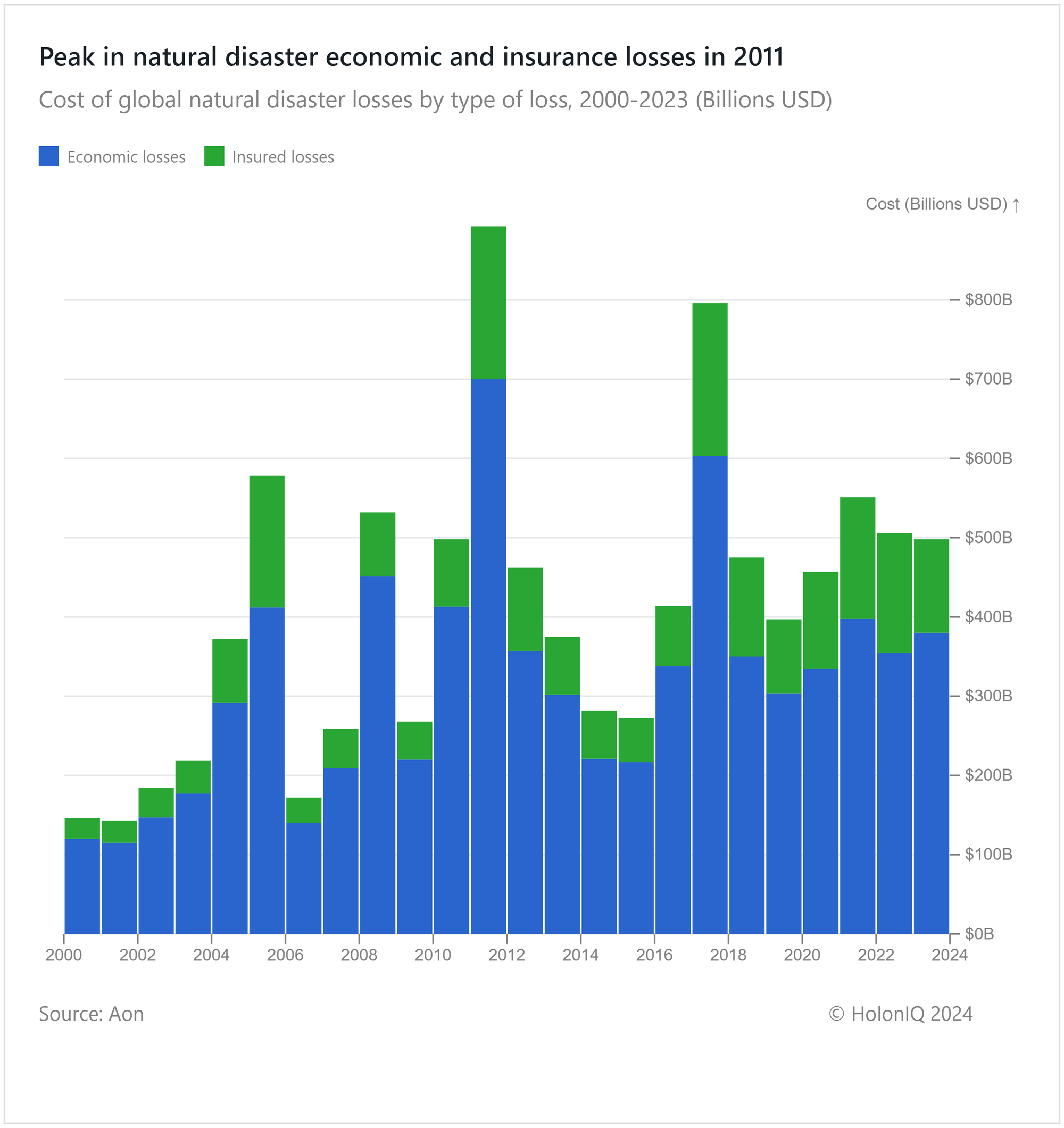 Global losses from natural disasters have remained high, reaching $500B in 2023. On average, this economic toll is nearly 3.7 times higher than the insured losses, highlighting a significant gap in financial protection against these calamities.